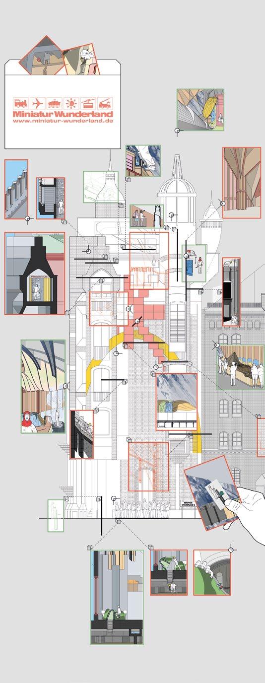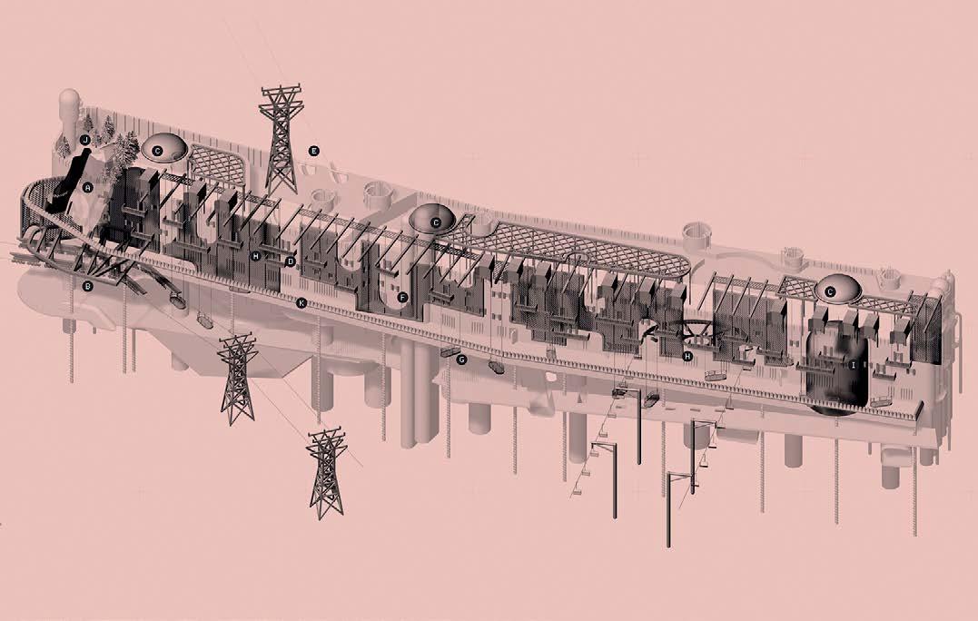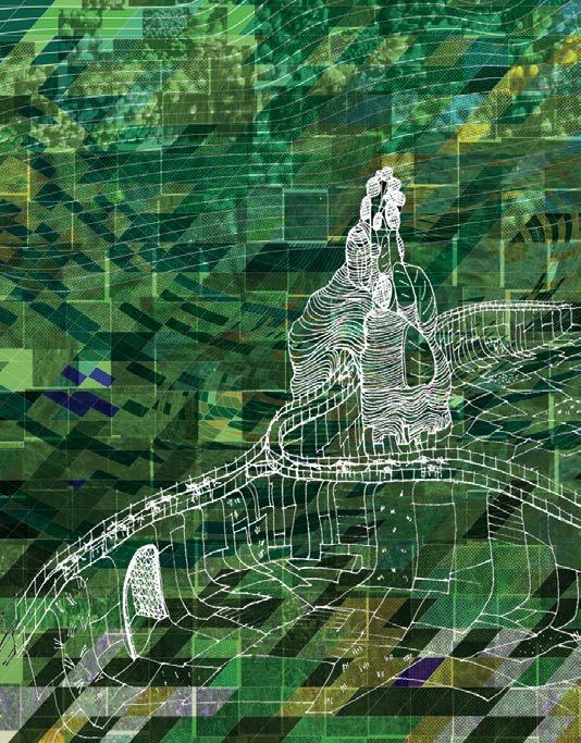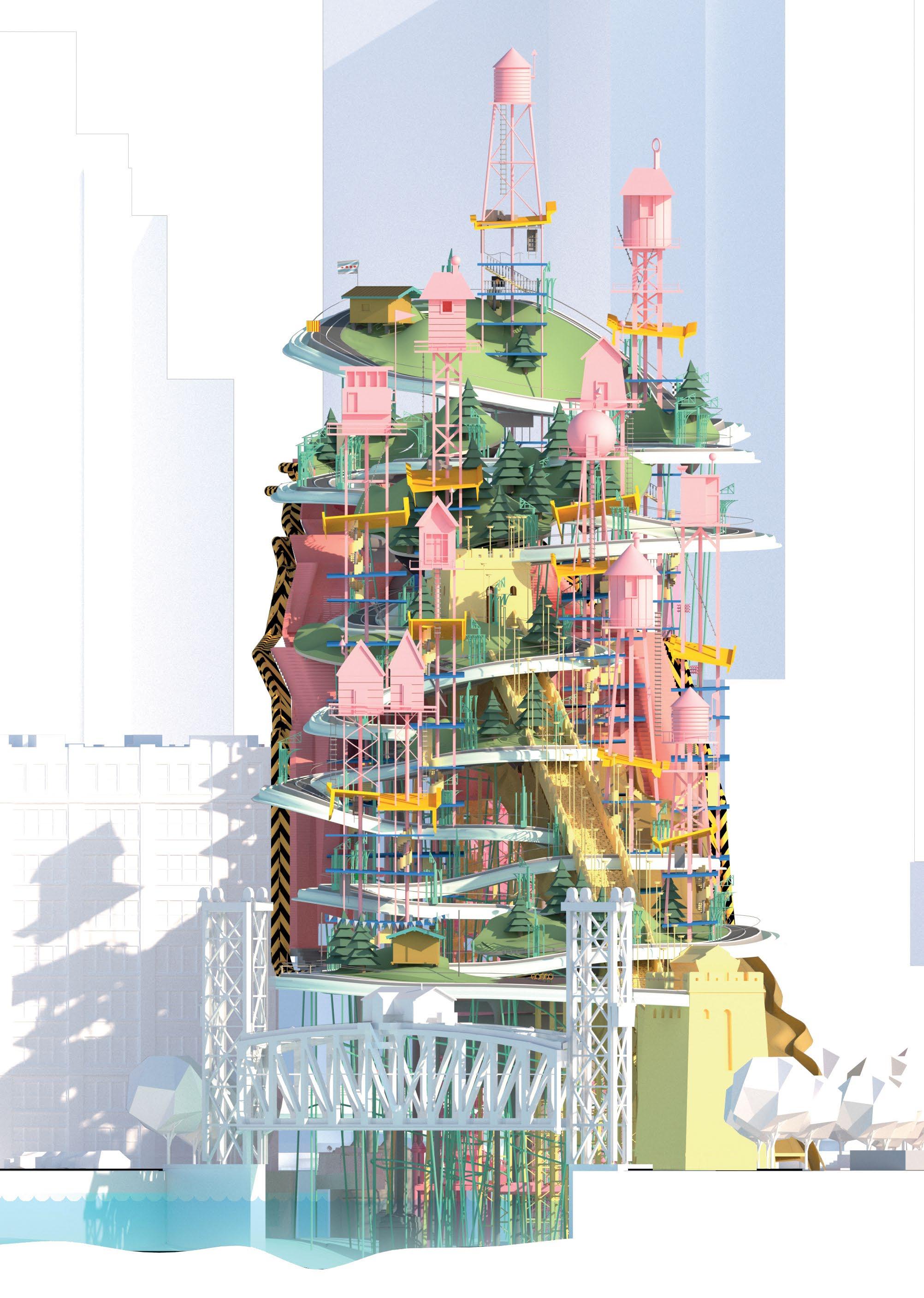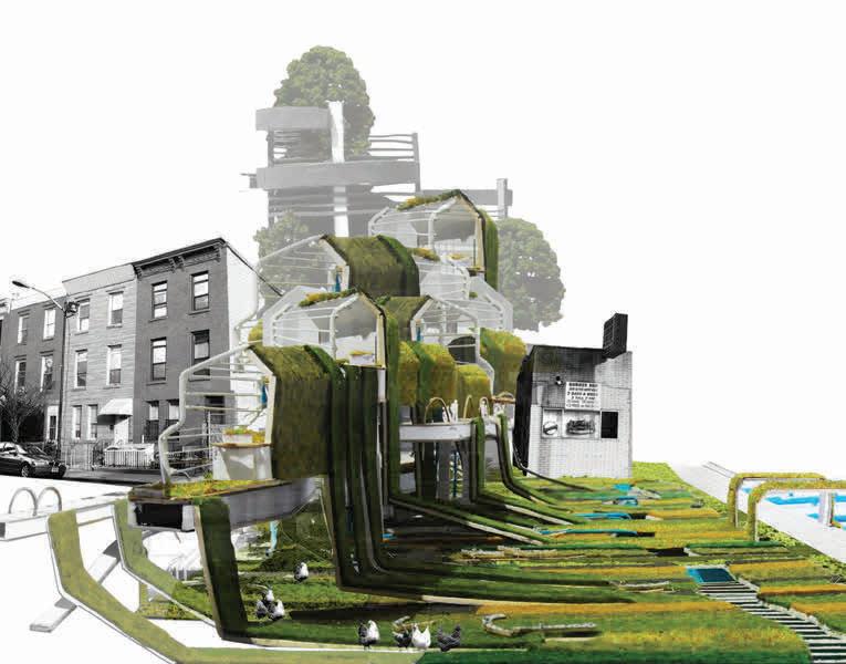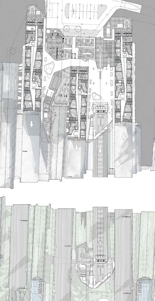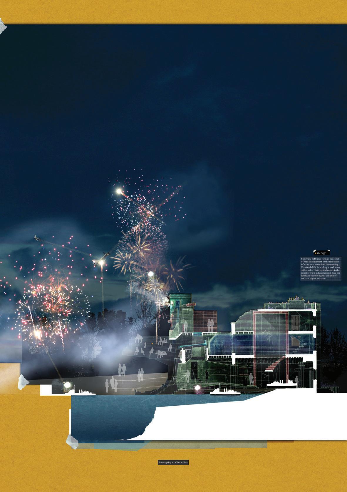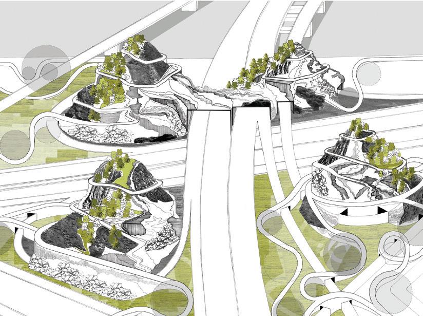 Fig. 11.15 Rebbeca Fode. L.E.S Quarry Tenement Museum. This project speculates that the Lower East Side’s Inwood Marble geology is more valuable than real estate prices and proposes the excavation and subsequent redevelopment of cliff sites and memorialised spaces. Fig. 11.16 — 11.17 Amy Hiley. Green Living City Wall, Hudson County, New Jersey. The ‘City Wall’ is an imagined super-dense vegetative structure; large greenhouses for food growth, interconnected with walkways and cycle paths, sky forest towers, recreational gardens, and farm market towers, fed through a circular metabolic method of managing and storing local water cycles. The wall wraps itself along the periphery of urban environments reflecting a sense of continuity, and synthesizing landscape, green infrastructure and architecture to