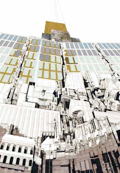 Fig. 11.1 Theo Games Petrohilos. The Air Futures Building, Wall Street, stands as the headquarters of the alchemic financial system that trades the air above Manhattan. Air bankers and their architecture of mania manipulate investments, investors and air flows to their own ends in this speculative future of the city’s existing TDR (Transferable Development Rights) market. Regulation nodes and air column model. Fig. 11.2 Yee Yan Adrienne Yau. The Inverted Street Market exploits Manhattan’s strict street vendors regulations. Fig. 11.3 Victor Hadjikyriacou. The Golden Core. A project investigating the expansion of the United Nations as a global economic organisation.