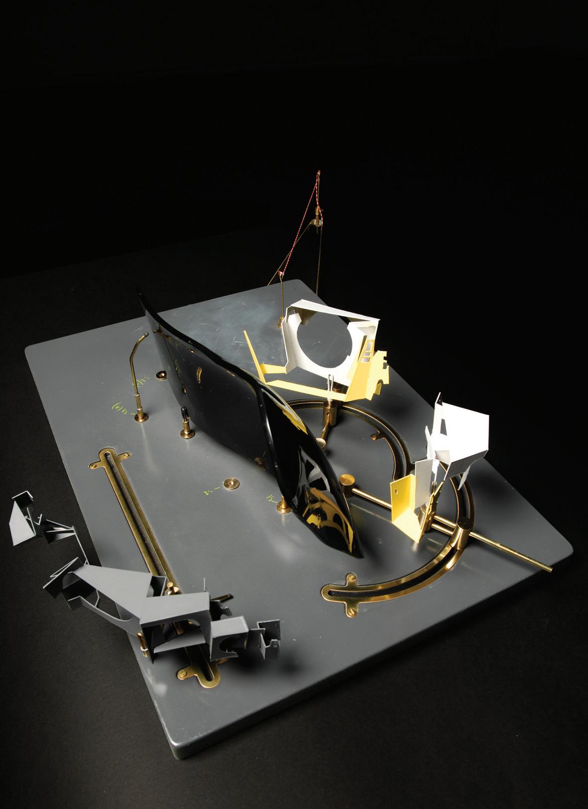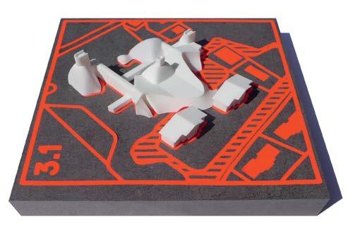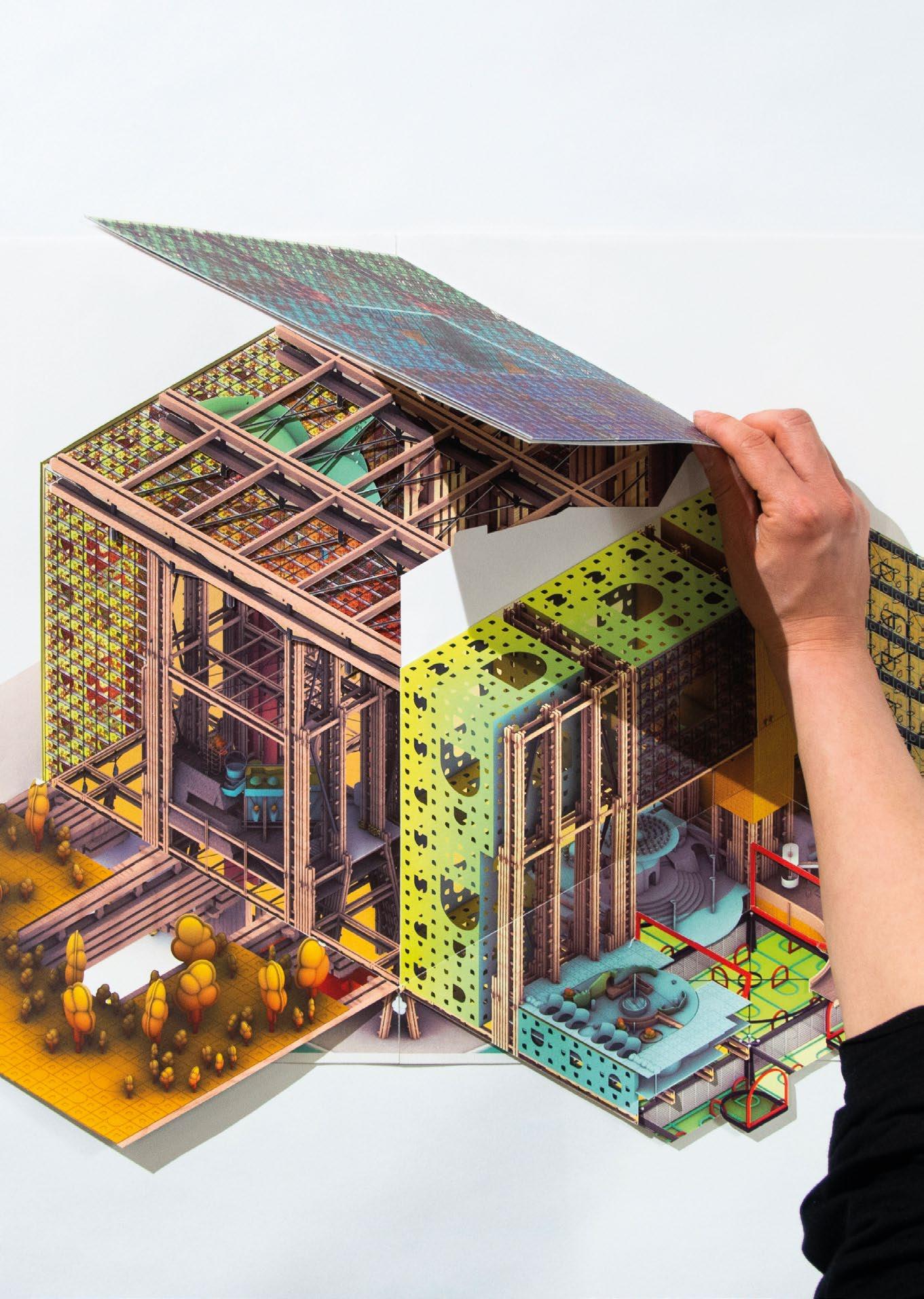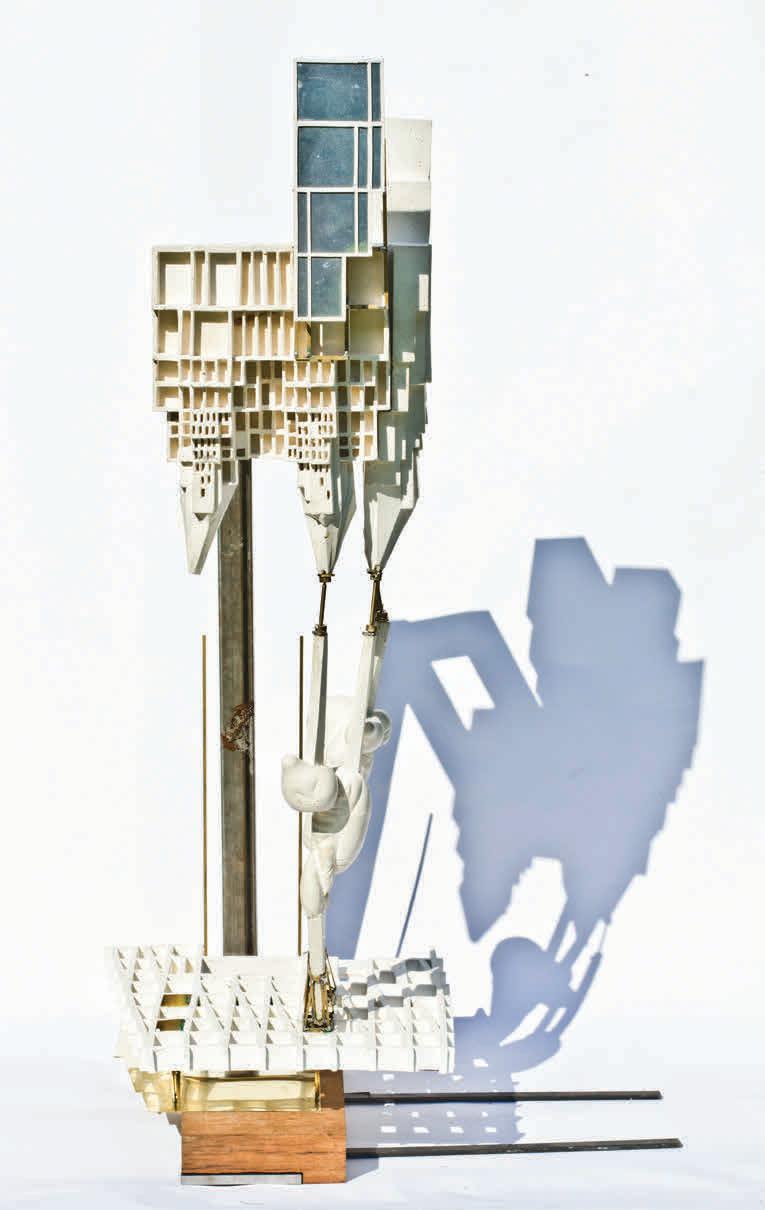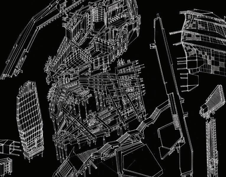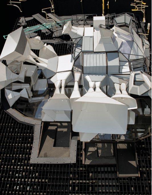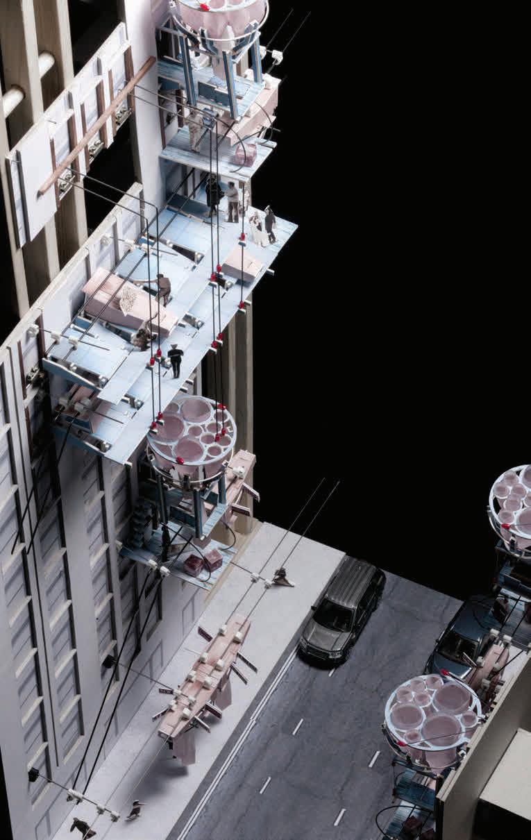 Licensing, Farringdon, London. A building for the storage of copyrights, licenses, and secret recipes. Axonometric of the main core. Fig. 11.12 Luke Royffe. Macy’s Balloon Factory, Pier 75 NYC. A sectional model showing the assembly of ‘Kermit’ the largest inflatable character in the Macy’s parade. The building is constructed from layered membranes hung on a lightweight frame, and can be expanded in response to the inflation (during the fabrication process) of the dirigibles within, transcribing the preparations for the parade into the consciousness of the city.