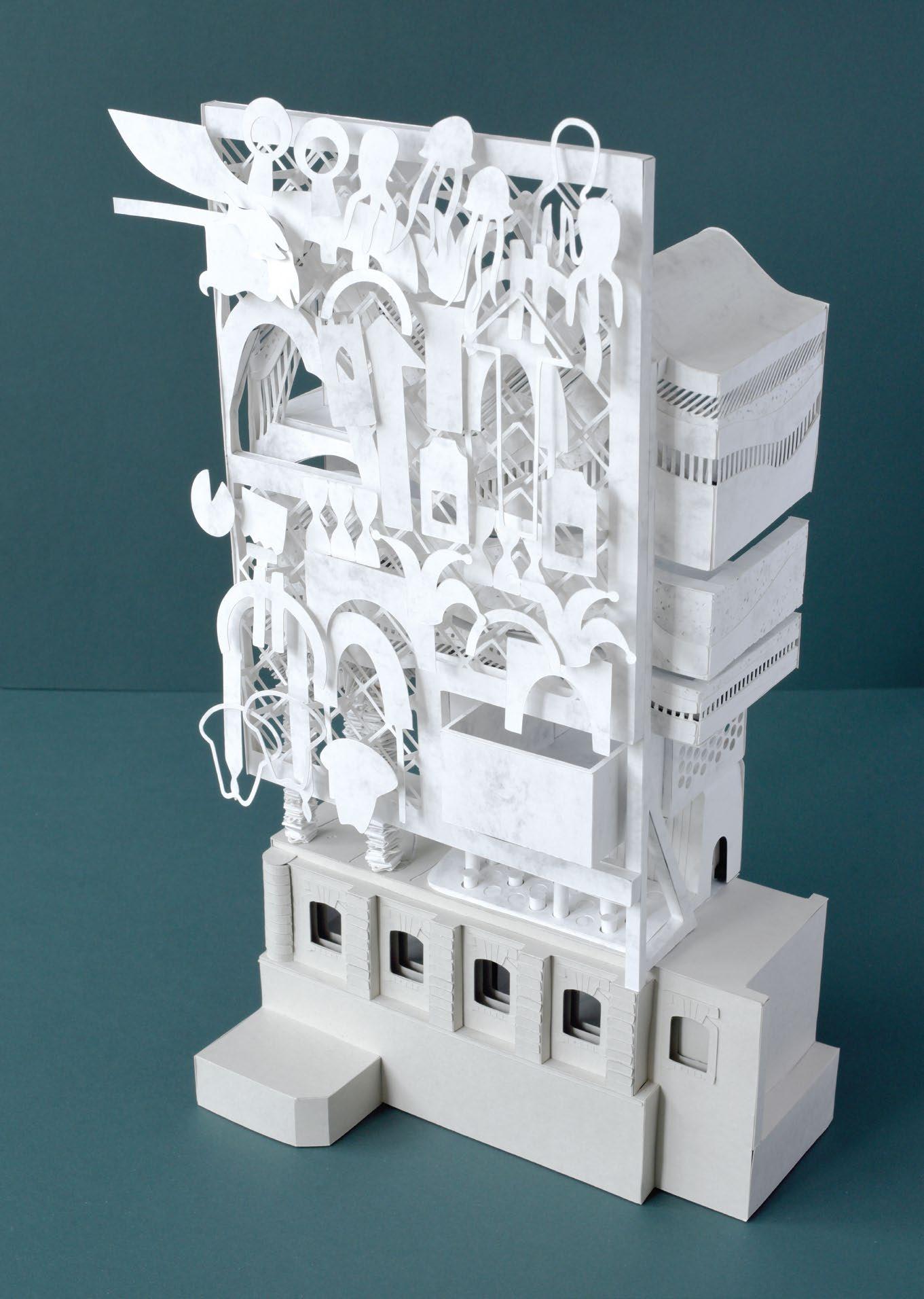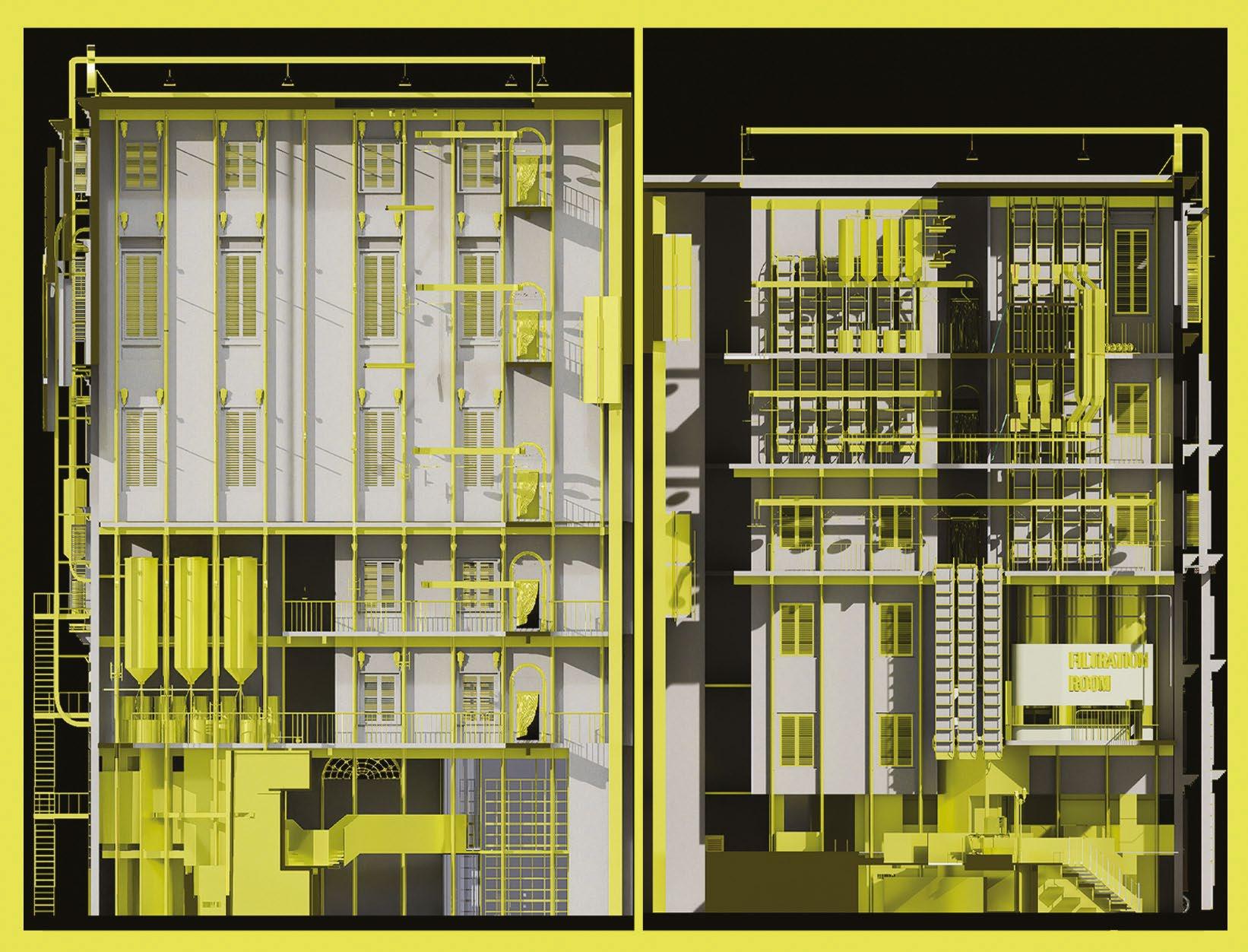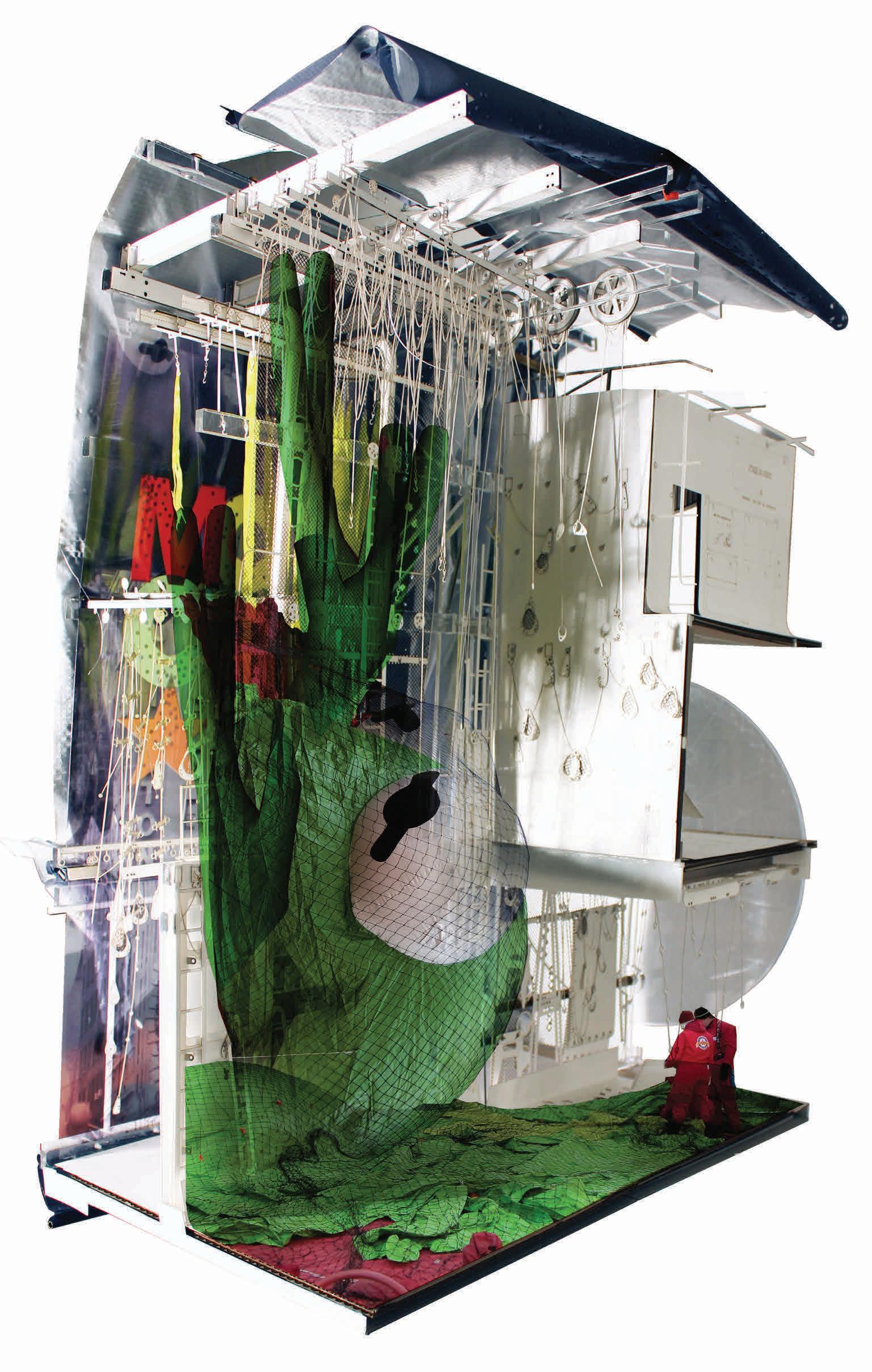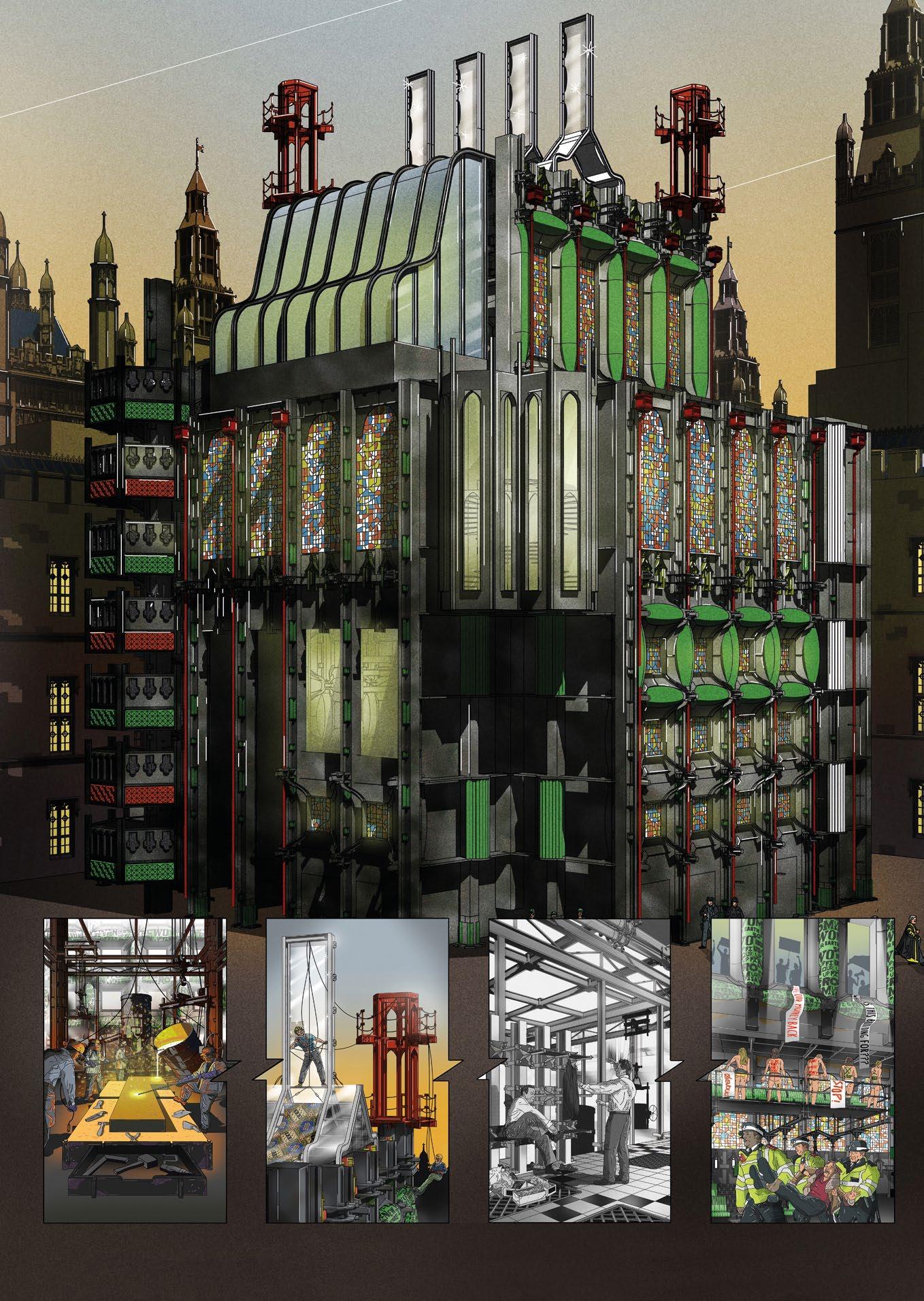 Licensing, Farringdon, London. A building for the storage of copyrights, licenses, and secret recipes. Axonometric of the main core. Fig. 11.12 Luke Royffe. Macy’s Balloon Factory, Pier 75 NYC. A sectional model showing the assembly of ‘Kermit’ the largest inflatable character in the Macy’s parade. The building is constructed from layered membranes hung on a lightweight frame, and can be expanded in response to the inflation (during the fabrication process) of the dirigibles within, transcribing the preparations for the parade into the consciousness of the city.