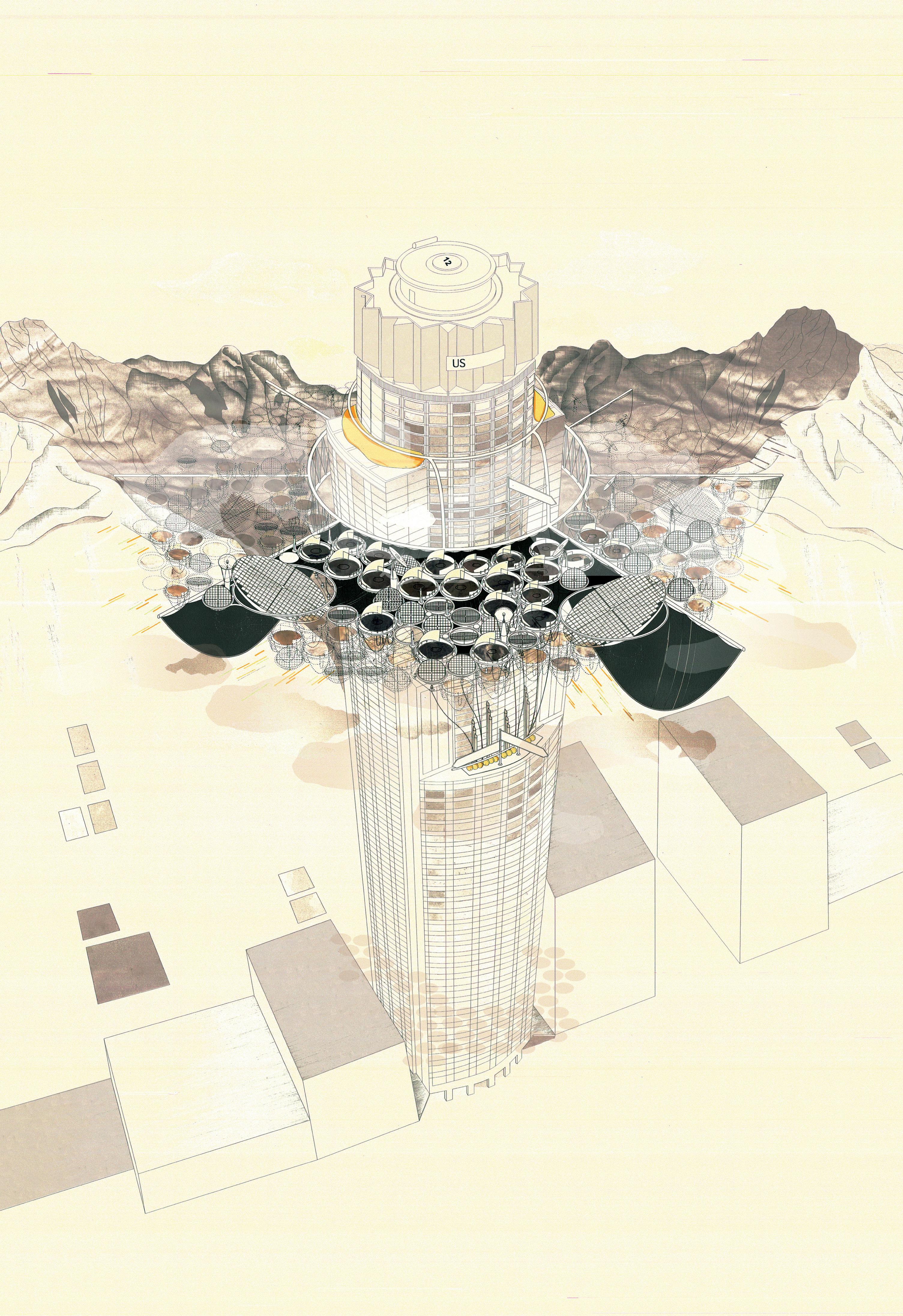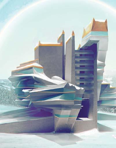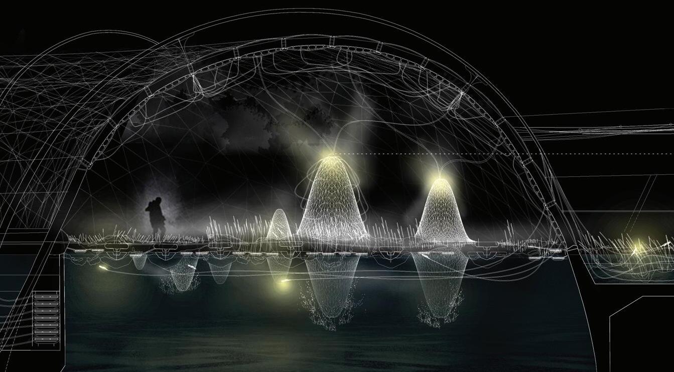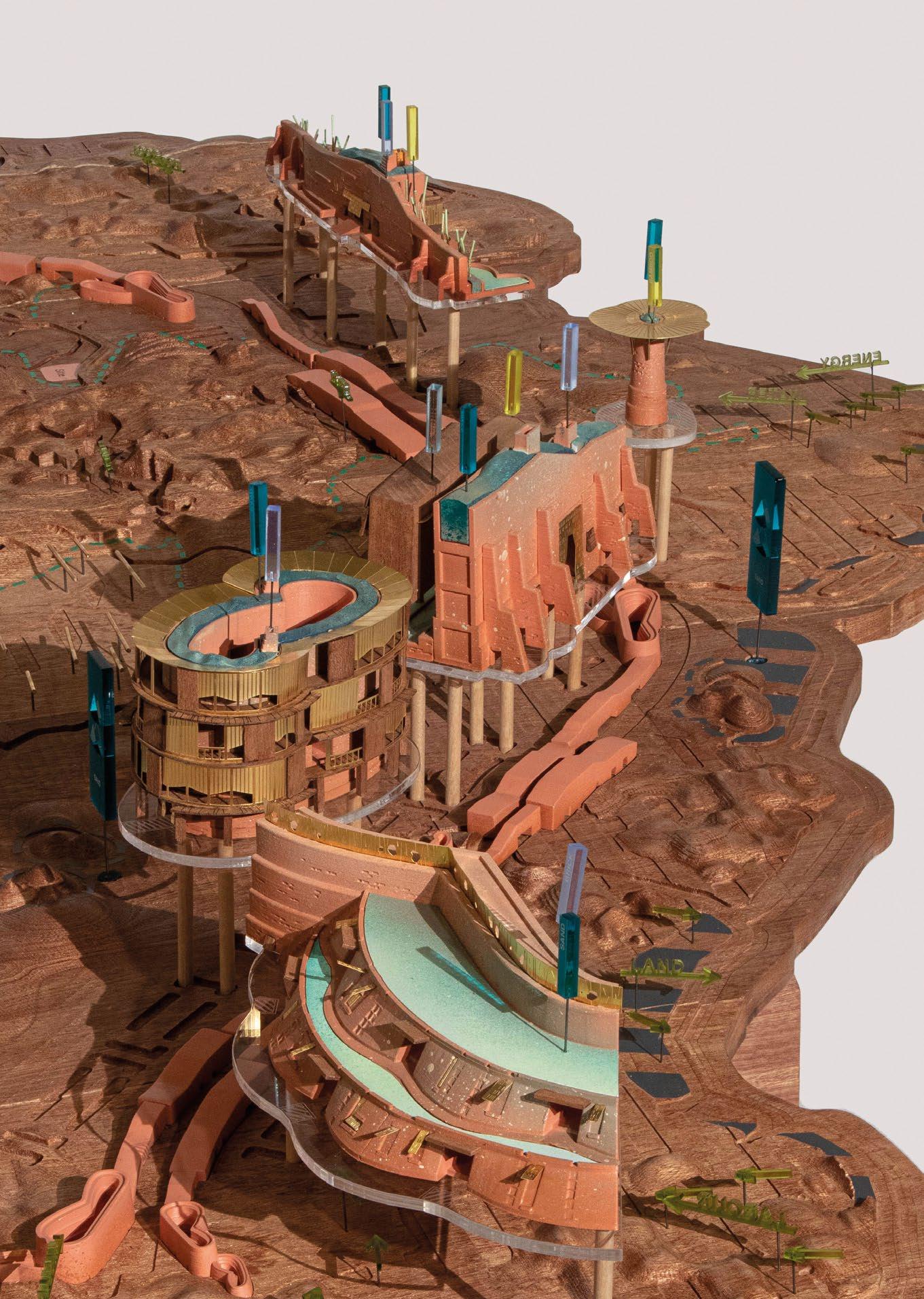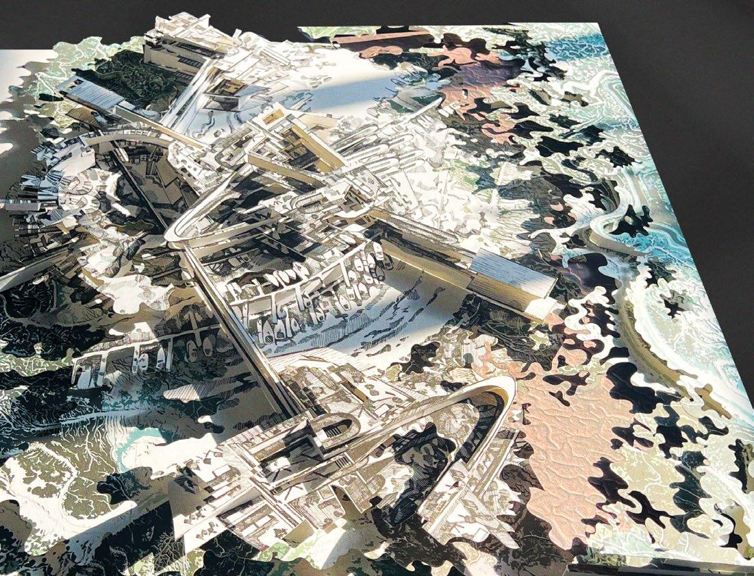 Fig. 11.15 Farah Badaruddin, Y5, From Cloud to Ground: Harnessing Lightning at Cape Canaveral. This project investigates the grave repercussions of NASA space exploration program, where it contributed to a significant amount of pollution to the surrounding Florida’s landscape. The project theorised on the notion of harnessing lightning for soil remediation purposes and the fabrication of fulgurites as byproducts of lightning. This adaptive reuse is hoped to rejuvenate the surrounding landscape of Cape Canaveral and Merritt Island into a space tourism hub and Space Lightning Thrills Park. Fig. 11.16 Sandra Youkhana, Y4, Imagineering Miami: Star Island Peak Points. Situated in the mouth of the Biscayne Bay, the island stands as a biproduct of dredging processes in Miami Beach. Plots are distinguished by their