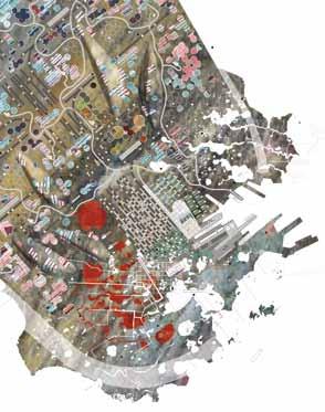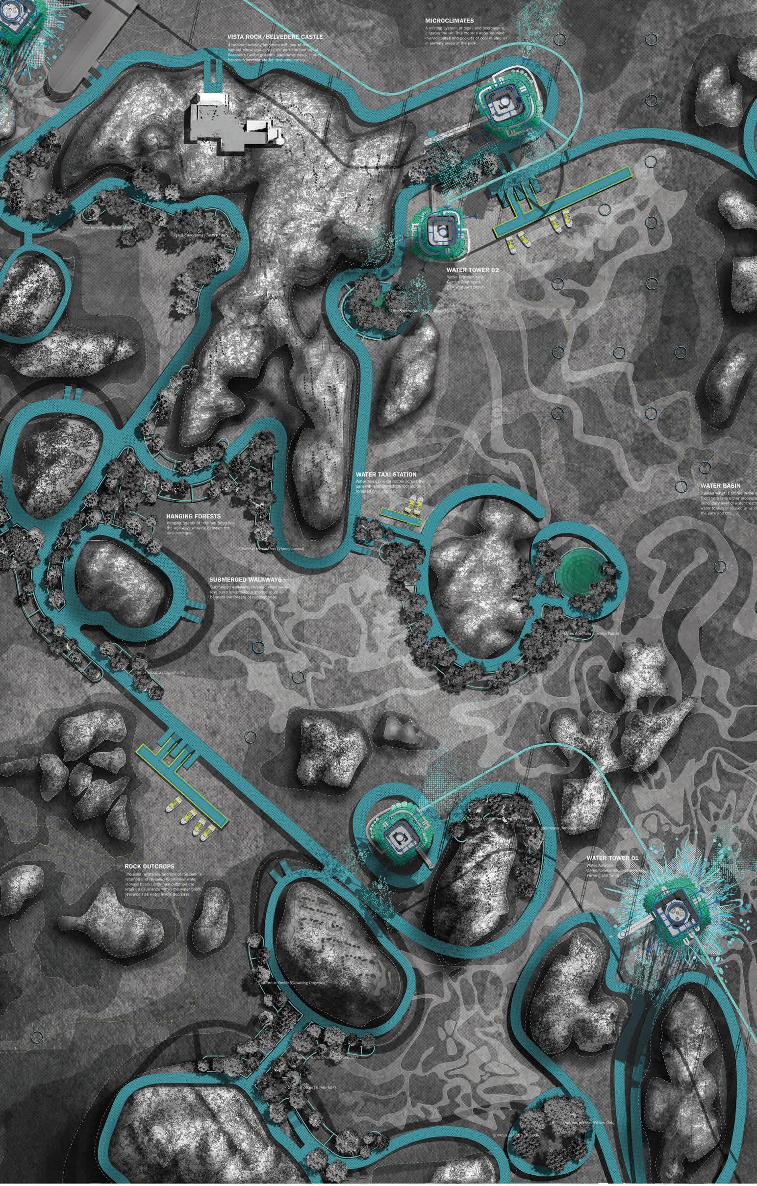 create an ecological, recreational and social catalyst. Fig. 11.18 Janinder Bhatti. Sacrificial Flooding: The Manhattan Island Bluebelt. Rock and Ramble detail. The scheme proposes the ‘Sacrificial Flooding’ of Central Park in order to deal with the problem of flooding in New York which results from the increasing climate extremes and the city’s outdated water infrastructure. Central Park is redesigned as an inhabitable water infrastructure which collects, cleans and subsequently recycles and exploits storm water to produce microclimates, energy, food and drinking water for the inhabitants of the city.