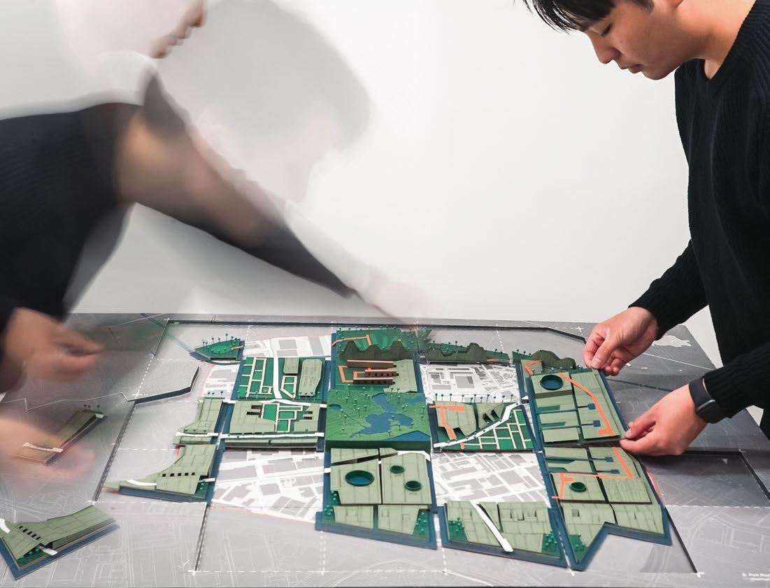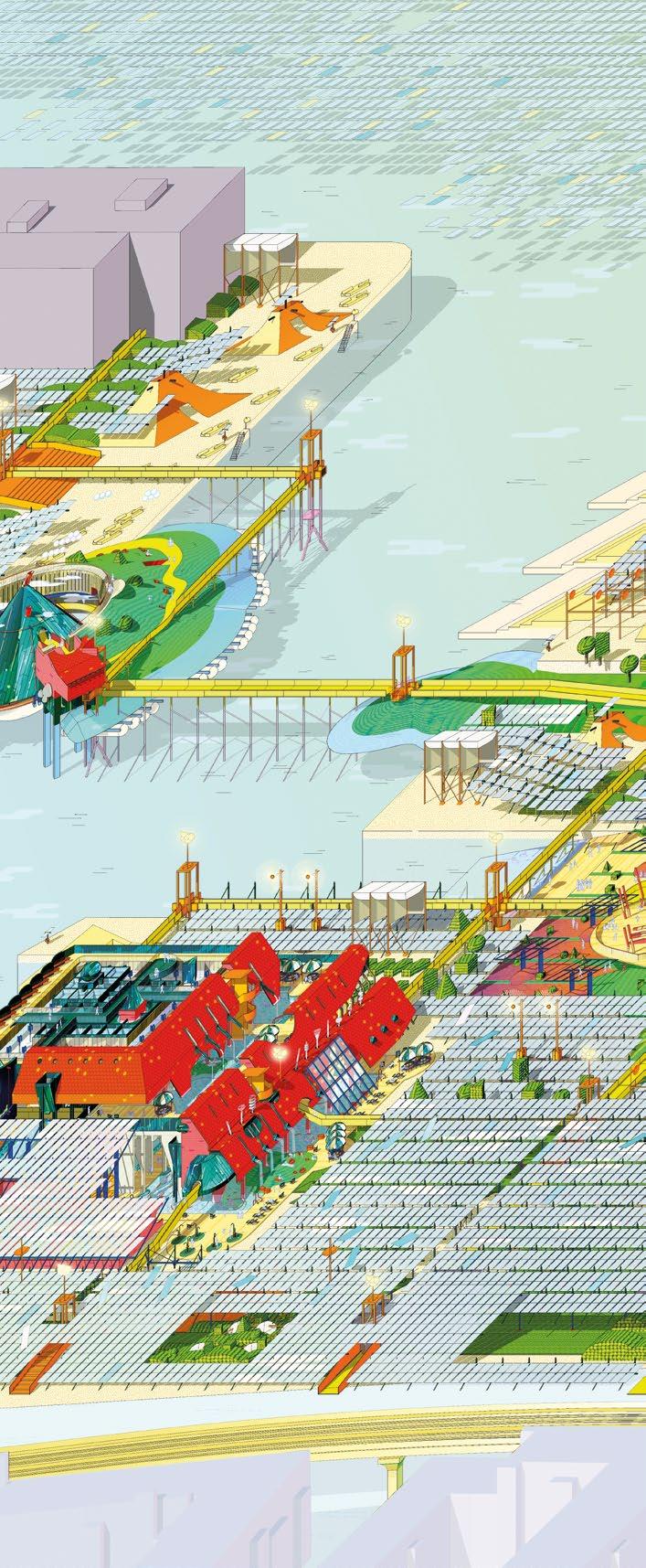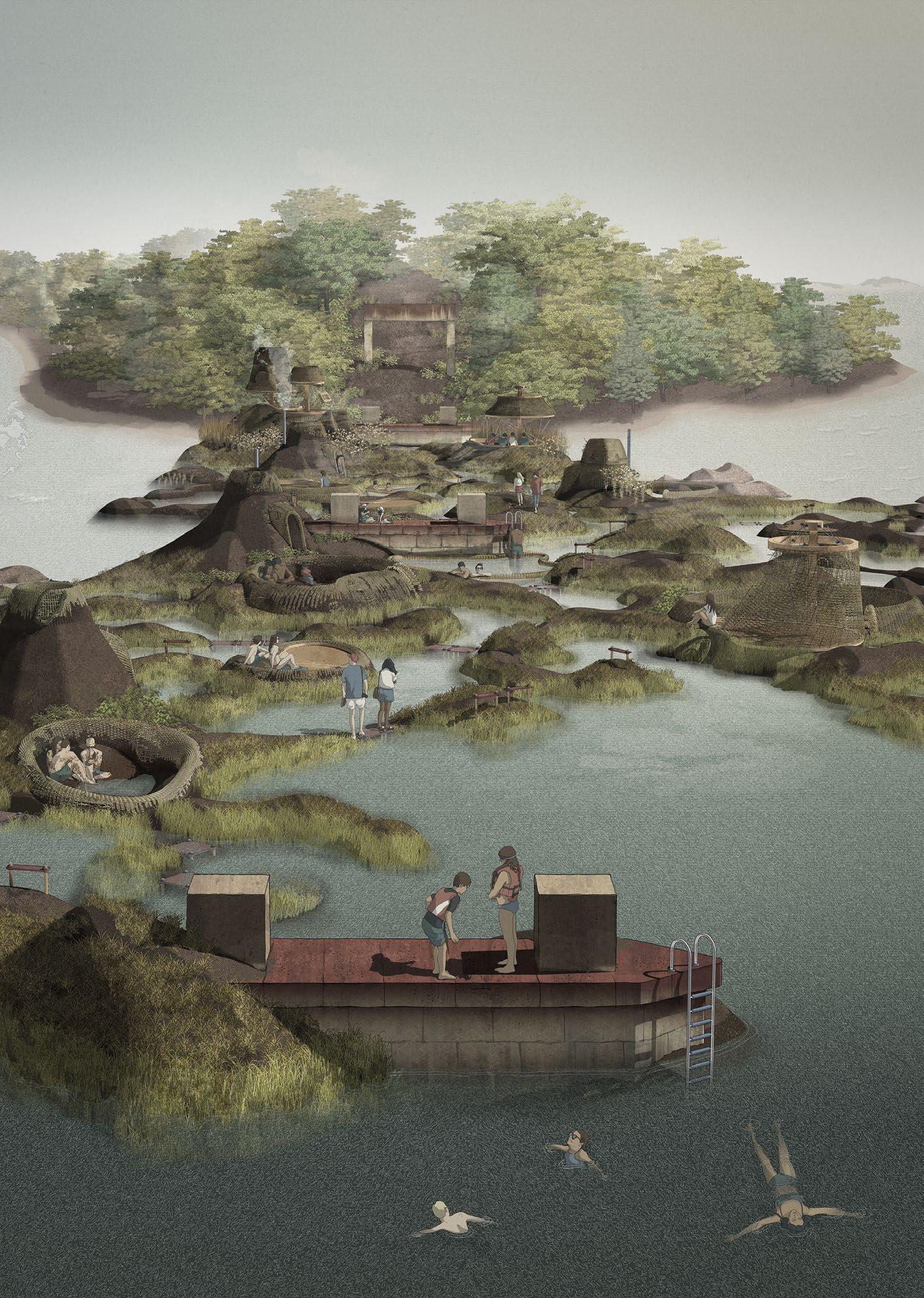11.11 Jaiwei Fan, Y5 ‘Artificial Washland’. This project proposes a flood-management landscape that embodies an alternative approach to addressing coastal erosion. A layered model integrates various scales and inspires a playful and participatory design process where a dialogue can unfold between biodiversity hotspots, flood infrastructures and a network of public buildings.