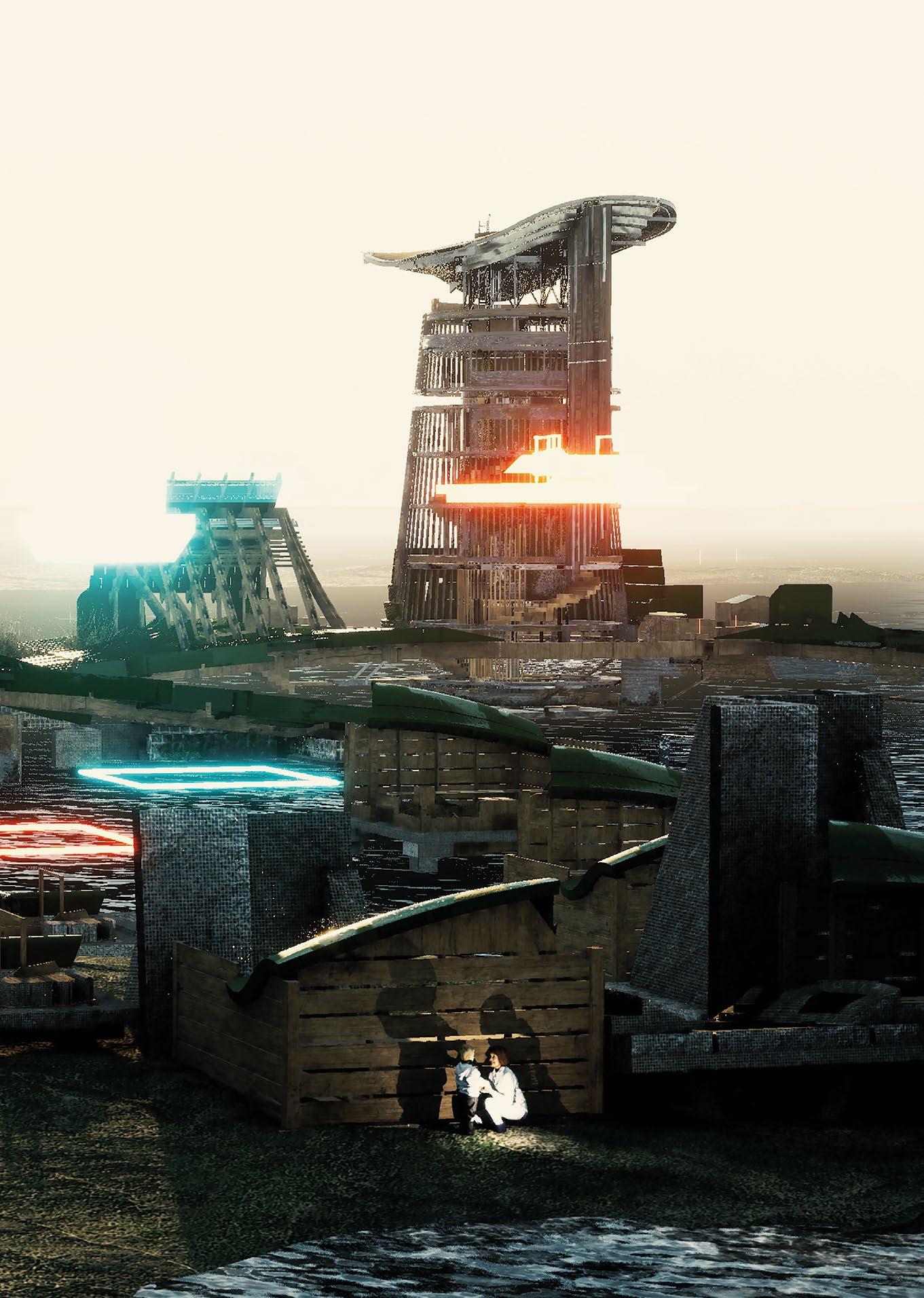 11.2 Rio Burrage, Y5 ‘Flooding and Dwelling’. Following a century of neglect of UK flood-mitigation infrastructure, large areas of settlements in the Thames Estuary are submerged due to rising sea levels and extreme weather. A reinterpreted Tilbury emerges within the tidal marshland, typically hostile to human occupation. By re-evaluating British cultures of building and dwelling, the ‘wicked problem’ of urban flooding becomes an opportunity for reconciliation between the urban and the natural.