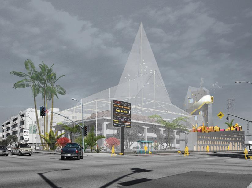 The Carbon Hoarding Bank is a rogue financial centre, capturing and storing carbon from the atmosphere in response to the increasing market demand for carbon credits and trading schemes and turning an environmental imperative into a lucrative commercial opportunity, Puente Hills Landfill site, Los Angeles Fig 11 10 Dan Marmot The Animal Emporium, Culver City, Los Angeles, embraces the fiction of LA, as monkeys swing from a pet hire tower, a landscape of mausolea for a pet crematorium hovers above a dog hotel, and a church-like aviary wraps around an existing building, creating a piece of urban theatre