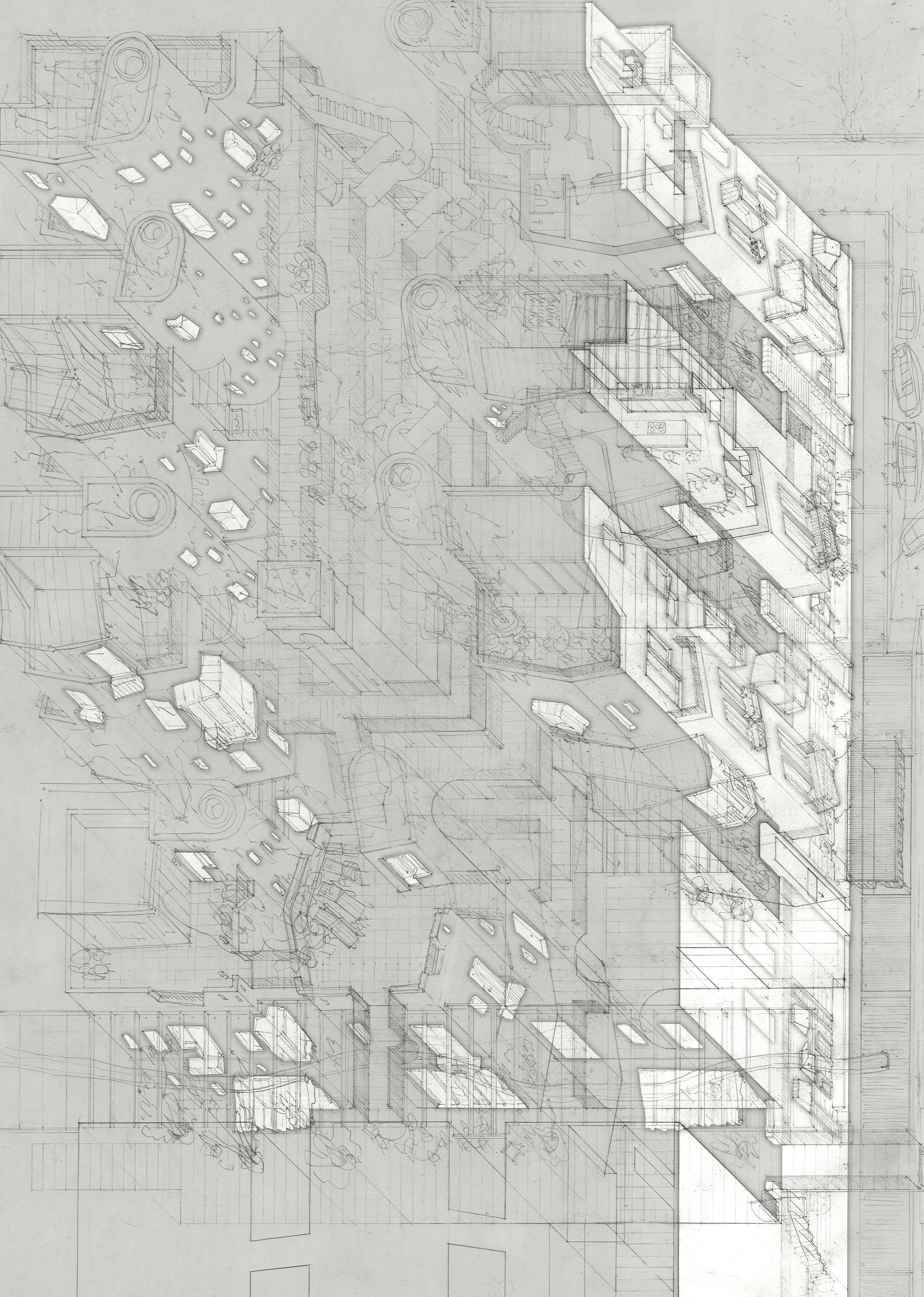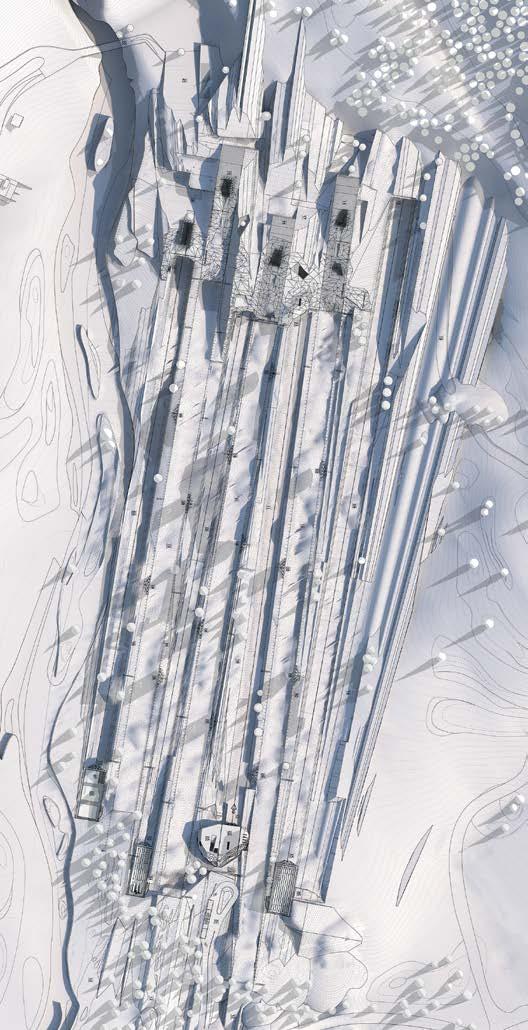 6 Sarah Nolan, Y5 ‘Corviale’. A masterplan and plug-in proposal reimagining Rome’s Corviale housing megastructure, carving a new social infrastructure to extend its life while reconnecting it with the landscape and community.