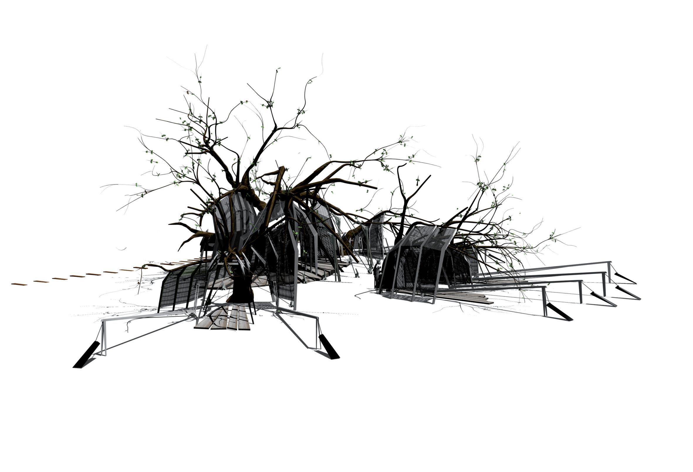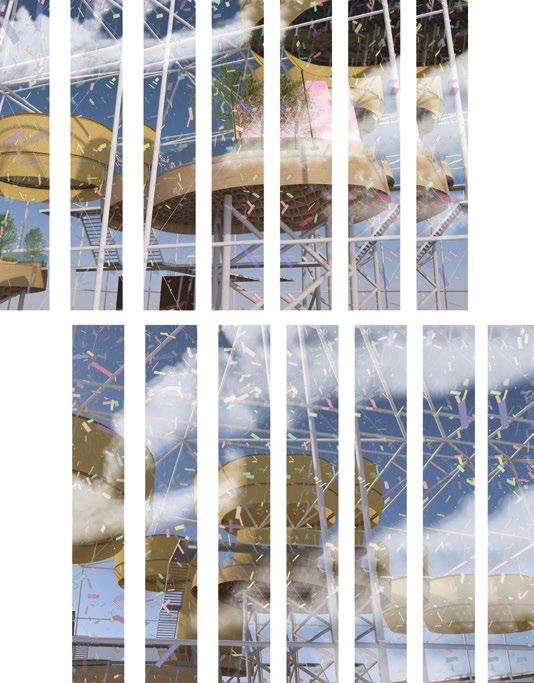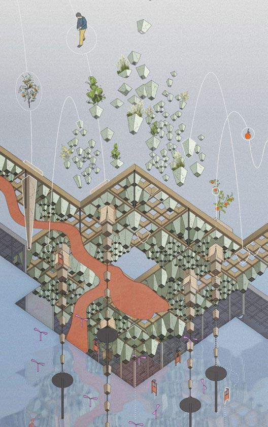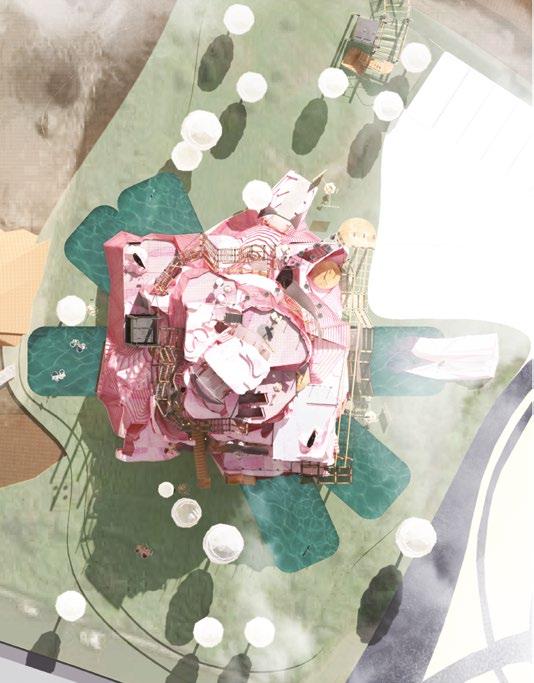21 Lily Kerr, Y5 ‘Atmosplay Grounds’. A tectonic system that integrates particulate matter filtration within pavilions, offering a spatial strategy for environmental remediation and enhanced public wellbeing.