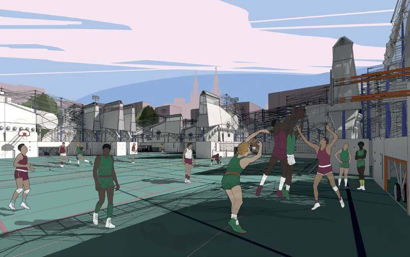 11.5 Jennifer Oguguo, Y5 ‘Fort Bec: Cultural Backdrops for Hybrid Publics’. This project stages a creative park in Becontree, wearing the guise of an industrial estate. A ‘cultural wall’ transforms Parsloe Park into manifestations of cultural stewardship, envisioning painting halls with picnic spots and local storage with prop archives. If home is one’s castle, Fort Bec is a public fortress, carving public territory into the changing landscapes of the Thames Gateway.