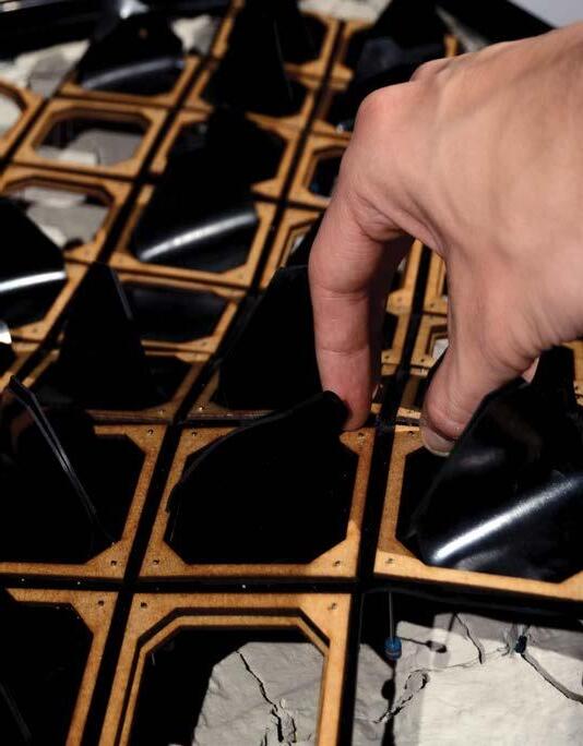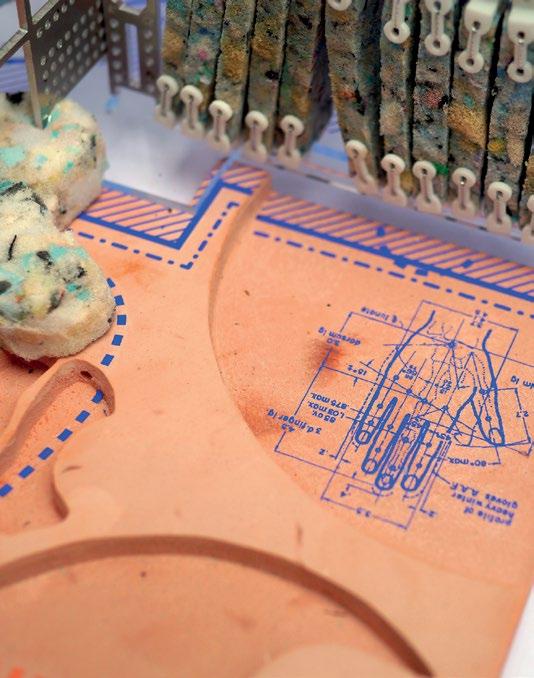 Fig. 11.5 Tom Partridge, Y5, Weirding Miami Beach. The Realigned Management plan speculates on the future of Miami Beach in a ‘weirding’ world, where rising sea levels and extreme weather require the reintegration of the coastal landscape into the urban street grid. The whole island acts to attenuate storms, from a new artificial beach where sand is treated as a valuable commodity to the Surgulator: an emergency energy storage device to reboot the city after a storm. Fig. 11.6 Daniel Felgendreher, Y4, The de-watering blanket explores different strategies to enhance the consolidation of industrial waste clay present in postphosphate mining landscapes in central Florida. The tested de-watering mechanisms were envisioned to become part of a building’s structure proposing an architecture that adapts to