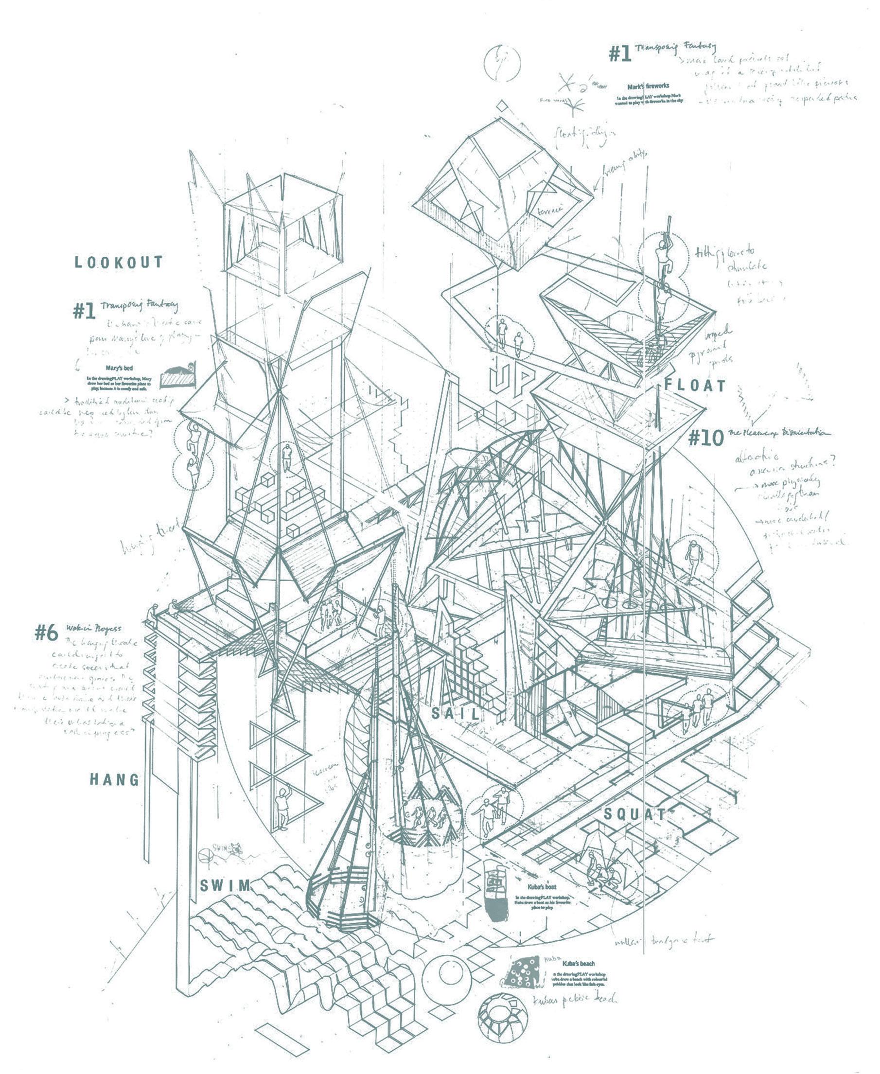 11.13 Jacqueline Zhi Qian Yu, Y5 ‘The Flooding School for Amphibious Living’. Harnessing the precarious liminality of flood-prone quarry sites along the Essex Colne Estuary, a matrix of floating and anchored structures, including habitable vessels, gardens, reservoirs and environmental systems, serve as sponges and playscapes. This architectural landscape experiments with adaptability to enable living with water as a response to an increasingly changeable environment.