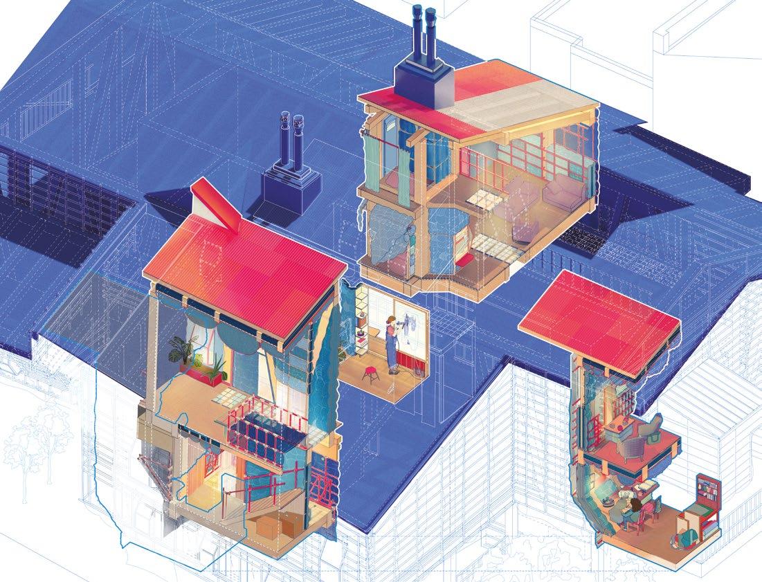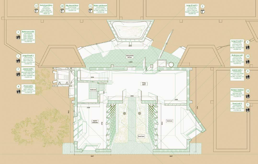 Fig. 11.13 Yee Yan (Adrienne) Lau, Y5, Reshaping Suburbia. Taking advantage of the fact that many foreclosed homes are sold at prices below their construction costs, their materials are recycled and re-configured into new model homes that co-house both locals and temporary residents. Subversive marketing is the key to popularise this new type of domestic architecture, which introduces healthy density and communal living into the traditionally conservative and isolated suburbia.