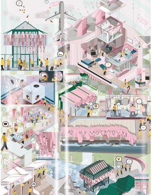 11.9–11.10 Ziyue Lorena Yan, Y5 ‘Managed Retreat: Innovating Sustainable Polder Communities on Swanscombe Peninsula’. This project establishes a test bed and natural reserve on the isolated and windswept Swanscombe Peninsula to experiment with landscape creation and community design. Challenging traditional land-sacrifice histories, this regeneration initiative redefines flood risk management. Resilient polders are created that utilise the incoming floodscapes to accommodate scientific communities.