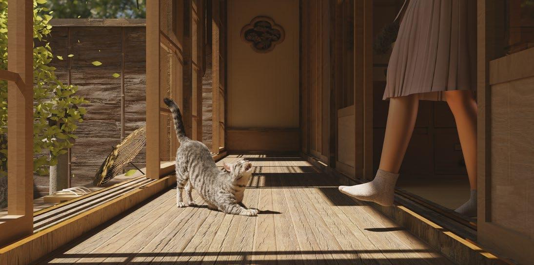 24.11–24.13 Yixuan (Aurelia) Lu, Y5 ‘Kyoto’s Adaptive Reverie’. In response to the endangered status of Kyoto’s iconic timber townhouses, the project redefines the architectural typology of machiya (traditional Japanese wooden townhouses) and their dual role as both cultural heritage and residential dwellings. The housing initiative delves into the essence of machiya, while acknowledging modern-day challenges, and transforms these traditional structures into adaptable, sustainable and flexible solutions for urban living. The design narrative is steered by a fictional Japanese character in the year 2054, who spearheads a housing cooperative scheme in honour of her lost childhood home. By purposefully setting the timeline in the future, the programme is conceptualised retrospectively, with the narrative designed to revitalise machiya and ensure the typology remains relevant.
