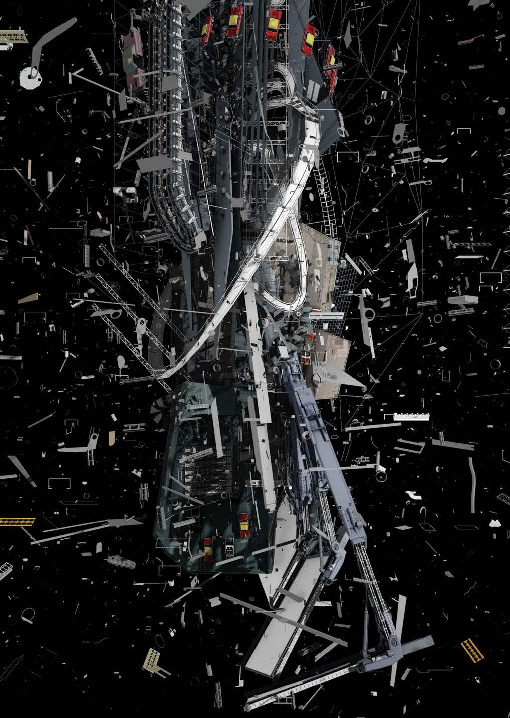symbolic birth of the diety Xuanwu, but today lies at the bottom of a reservoir constructed by the Communist Party in 1967. Reaching the island by boat the visitor passes through a series of charged thresholds and physically completes the destroyed Xuanwu narrative, the lost faith, by accessing the submerged ruin undewater. Fig. 24.4 Deng (Aiden) Ai Y5, ‘New York Automobile Museum’. Acting as a monument to the car and its impact on the 20 th century American city, the New York Automobile Museum celebrates and mournfully reflects upon the doomed and intoxicating love affair between American culture and the image of the car. The automobile industry is at once glorified and also vilified through the symbolic destruction and explosion of components on a daily cycle. A blown-out hurricane.