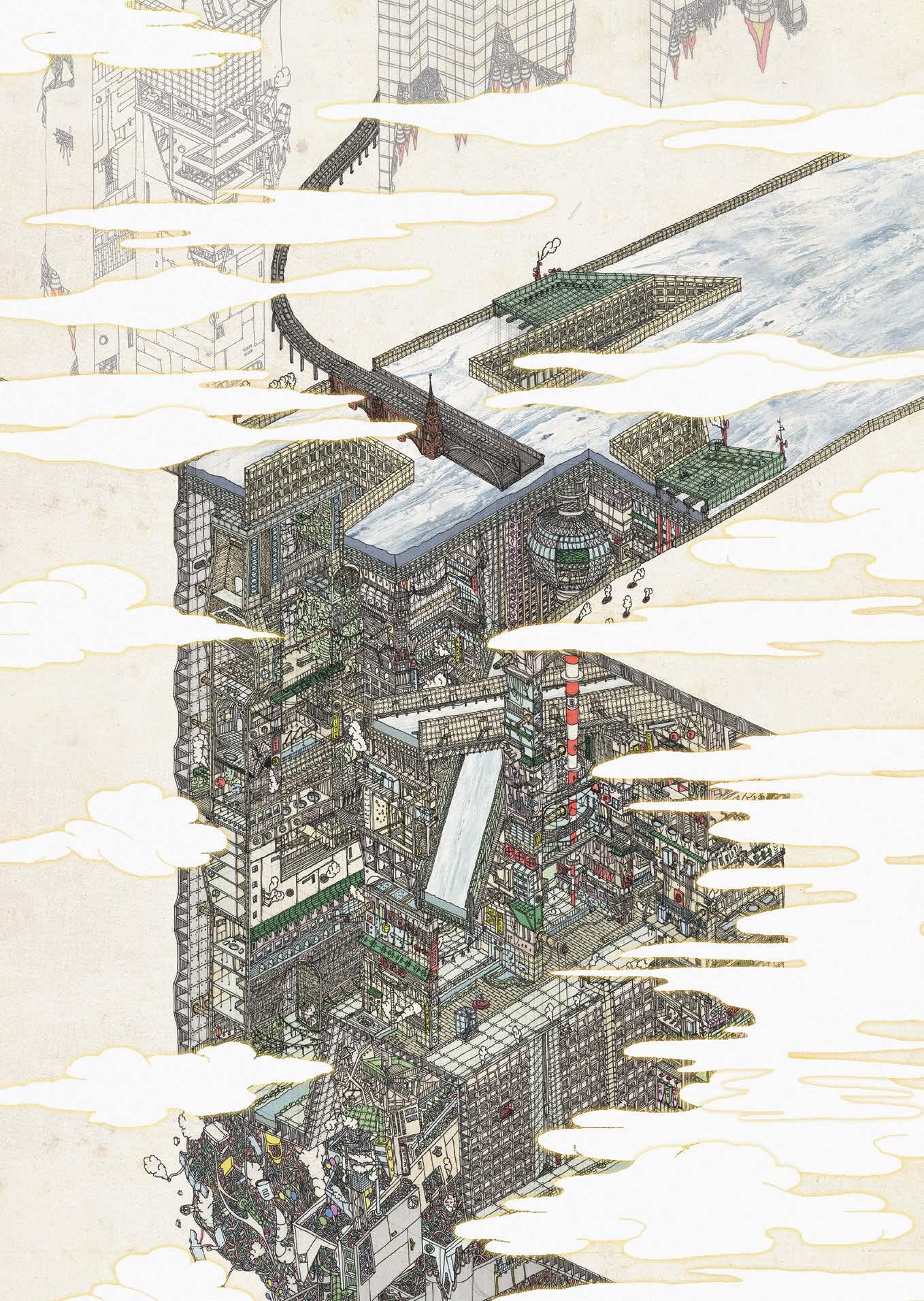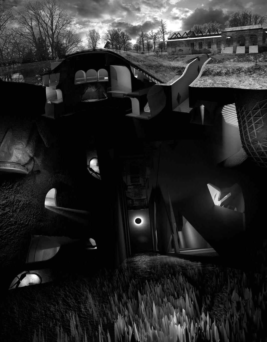 Fig. 24.8 Kelvin Ip Y4, ‘Blossoming Bridge’. The project proposes an ornamental movable bridge housing a hybrid programme of a post office/shopping arcade. Soft ornaments grow and expand in response to both environmental and functional cycles mimicking the blossoming of flowers creating a decorative choreography. Fig. 24.9 Keiichi Iwamoto Y5, ‘Berlin Estrangement’. Exploring Berlin’s underground, a space that has strong associations with both fear (bunkers and wartime bombing) and freedom (tunnelling under the Berlin Wall to escape), the project imagines an allegorical ‘deep underground’ and constructs a utopian future that challenges, inverts and expands the current urban reality of the city.
