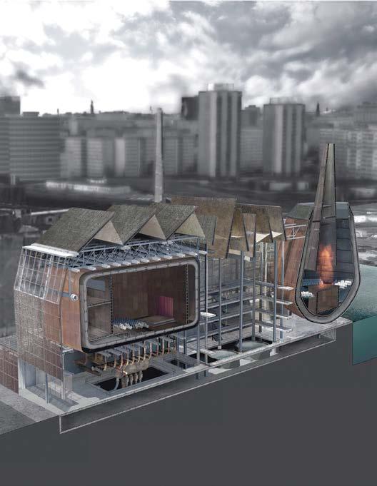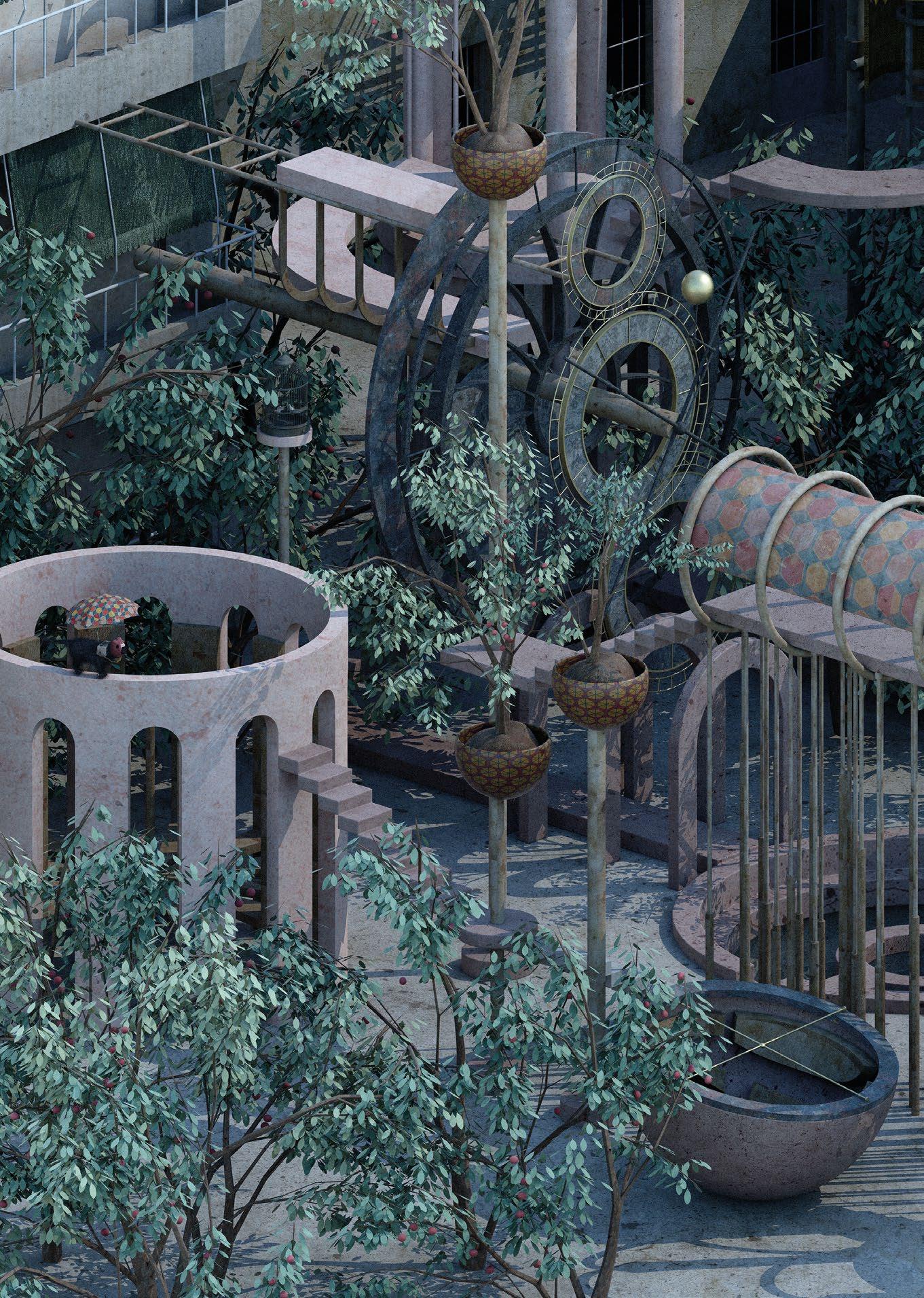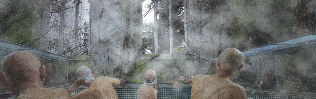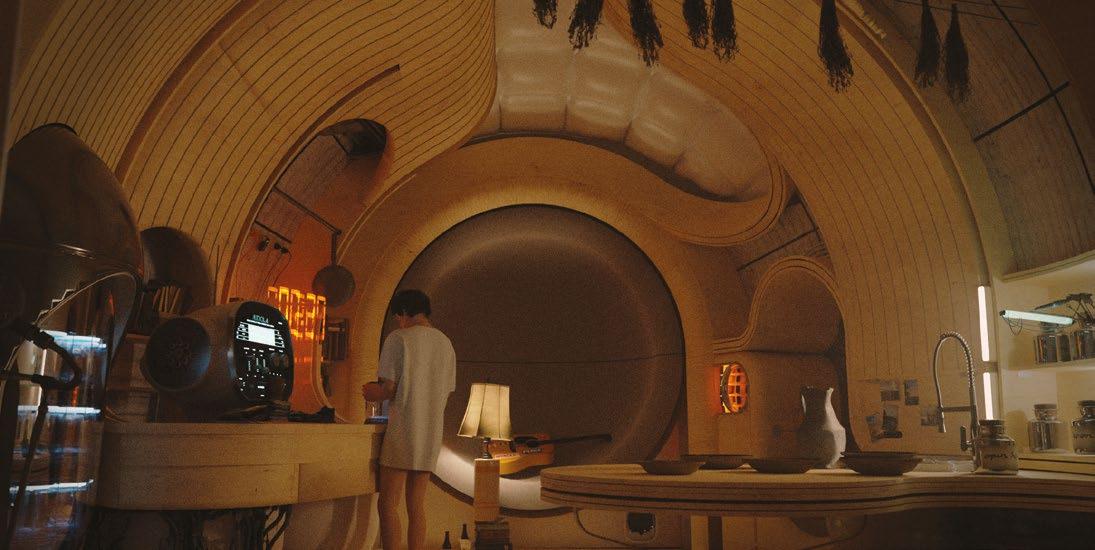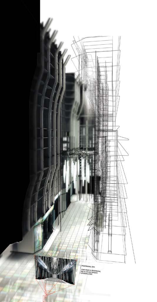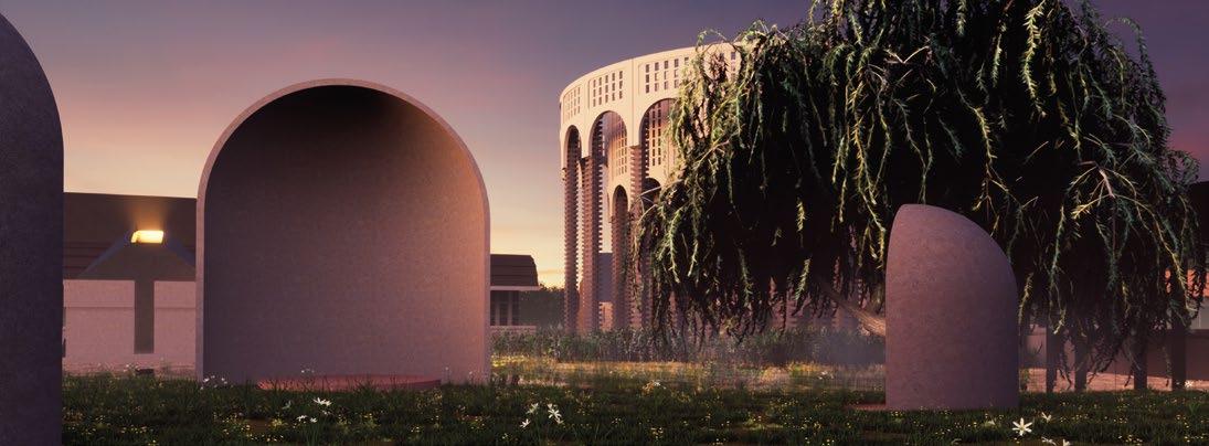 Chak Ming Anthony Tai, Y5 ‘Kowloon Reimagined: Bridging Hong Kong’s Past and Future’. This research project explores the preservation of Hong Kong’s identity through the sustainable redevelopment and regeneration of 1950s tenement buildings. The city has faced a loss of identity due to increasingly largescale redevelopment and gentrification in local areas. These practices, accompanied by the constant demolition and profit-driven culture, have hindered the development of a distinct architectural identity for Hong Kong. The investigated district of Kowloon City was a vibrant neighbourhood where multicultural communities gathered. Currently, the area faces the imminent displacement of its ageing community to make way for large-scale housing developments. The project offers an alternative vision that prioritises local communities over corporate profits and develops a typology that conserves Hong Kong’s culture and identity through adaptive reuse. By exploring strategies that establish a symbiotic relationship with the existing fabric, this research revives materials associated with local traditions and history. Notably, timber emerges as a forgotten material with the potential to bridge Hong Kong’s future architectural identity with its pre-colonial past. By exploring new technologies in timber, this project ultimately develops a range of regenerative strategies across various scales. 24.3–24.6 Loukis Menelaou, Y5 ‘The Future Is in the Past’. The Palmscape Hotel has everything to ensure the most relaxing of holidays: seaside views, an infinity pool, a meze restaurant and direct access to the beach. Or so it seems... ‘The Future Is in the Past’ is an allegorical exploration of narrative-driven architecture, virtual world-building and the reinterpretation of history to shape our future. The narrative is led by the oral stories of displaced Cypriot people who in July of 1974 were forced to move away from their hometown and can now only access it through their minds and memories. The architectural intention manifests itself as a resort, located in the ghost town of Varosha in Cyprus. The design and materiality of the spaces are informed by the metaphors they carry and the actors in Cypriot history they represent. As an allegory of the displaced person’s mind, the Palmscape Hotel exists as a projection, haunted by the trauma of war. It serves as a reminder that history is a construction, urging the audience to embrace alternative readings and break away from a linear understanding of the past to shape a progressive future. 24.7–24.10 Matthew Semião Carmo Simpson, Y5 ‘The Devil You Don’t’. Drawing inspiration from Bergsonian theories of time and memory, the proposal examines the relationship between architecture, music and memory through the lens of dementia. Parasitising the infrastructure of the abandoned York Road tube station, the project creates an architectural promenade. The programme combines and spatialises the premises of patient-specific music playlists and sensory gardens, deploying virtual space to stimulate the senses and evoke specific memories of a fictional protagonist’s life. Brick, known for its nostalgic connection to British architectural heritage, was chosen as the primary material. Claybased ornamentation complements the brickwork, bridging tradition and innovation. The proposal introduces a proportional system based on musical notes and harmonies, translating musical form into architecture. The entire scheme’s development, from arrangement to detailing, was governed by this musical process. The interdisciplinary methodology incorporated hand drawing, digital modelling, rendering, film and musical composition. The film deploys music, moving images and architecture to depict the process of mental deterioration. What is being proposed is less the building itself and more a system for generating space – virtual or