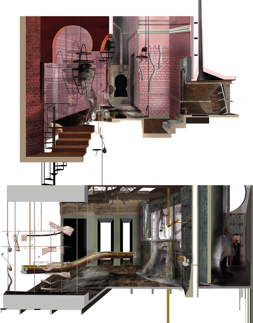 24.14 Beatrice Frant, Y5 ‘The Domestic Alien’. Developed as a three-act play set between Bucharest and London, the theatrical set defines the female psyche as a tangible way to inhabit domestic architecture. The project addresses the lack of belonging in familiar spaces, using ficto-critical narratives to visualise the alienating experience. It analyses sociopolitical situations in which women felt confined by their homes, combining transformative structures with accurate site portrayals. Additionally, the project proposes a visual reinterpretation of the female body as an othered ‘alien’ through the use of inflatables. By choosing the kitchen, the bedroom and the bathroom to depict the stage set, it questions whether buildings can respond to the specific psychological needs of a woman/alien.