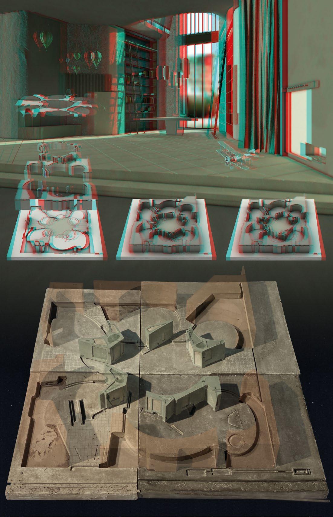 Fig. 24.14 Isaac Eluwole, Y5, The Quotidian Utopia, Aaron’s Undercroft, film still. The project seeks to reappraise forgotten and maligned Modernist spaces, countering preconceptions then inverting them with counter-cultural augmentations and interventions. Beginning by photographing and modelling each site in meticulous detail, the spaces undergo softwarebased transformations, from which each intervention is generated. A study of the prejudices surrounding the site, actual and perceived uses, and historical occurences gives rise to the intervention’s programme. Fig. 24.15 Isaac Eluwole, Y5, The Quotidian Utopia, The Memorial spatial construct, film still. Fig. 24.16 Isaac Eluwole, Y5, The Quotidian Utopia, The Memorial in construction, film still. Fig. 24.17 Jonathan Holmes, Y5, The Stahl House,