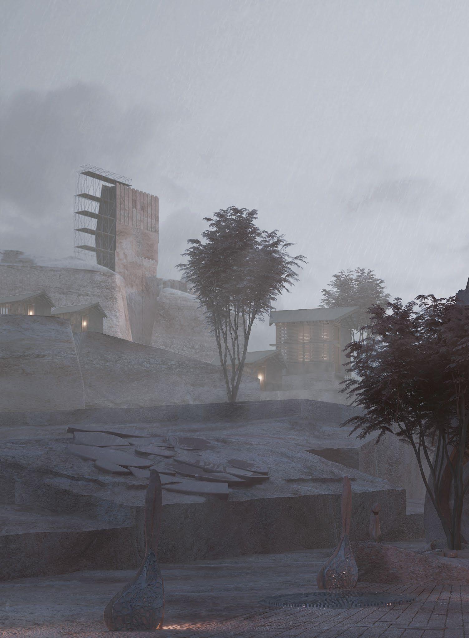 2 Tara Abdol Hossein Zadeh, Y4 ‘Stones Against Diamonds’. Reimagining the remediation of the Fontainhas Escarpment. Granite is reclaimed through a process of embedding and bricolage towards an architecture of permanence.