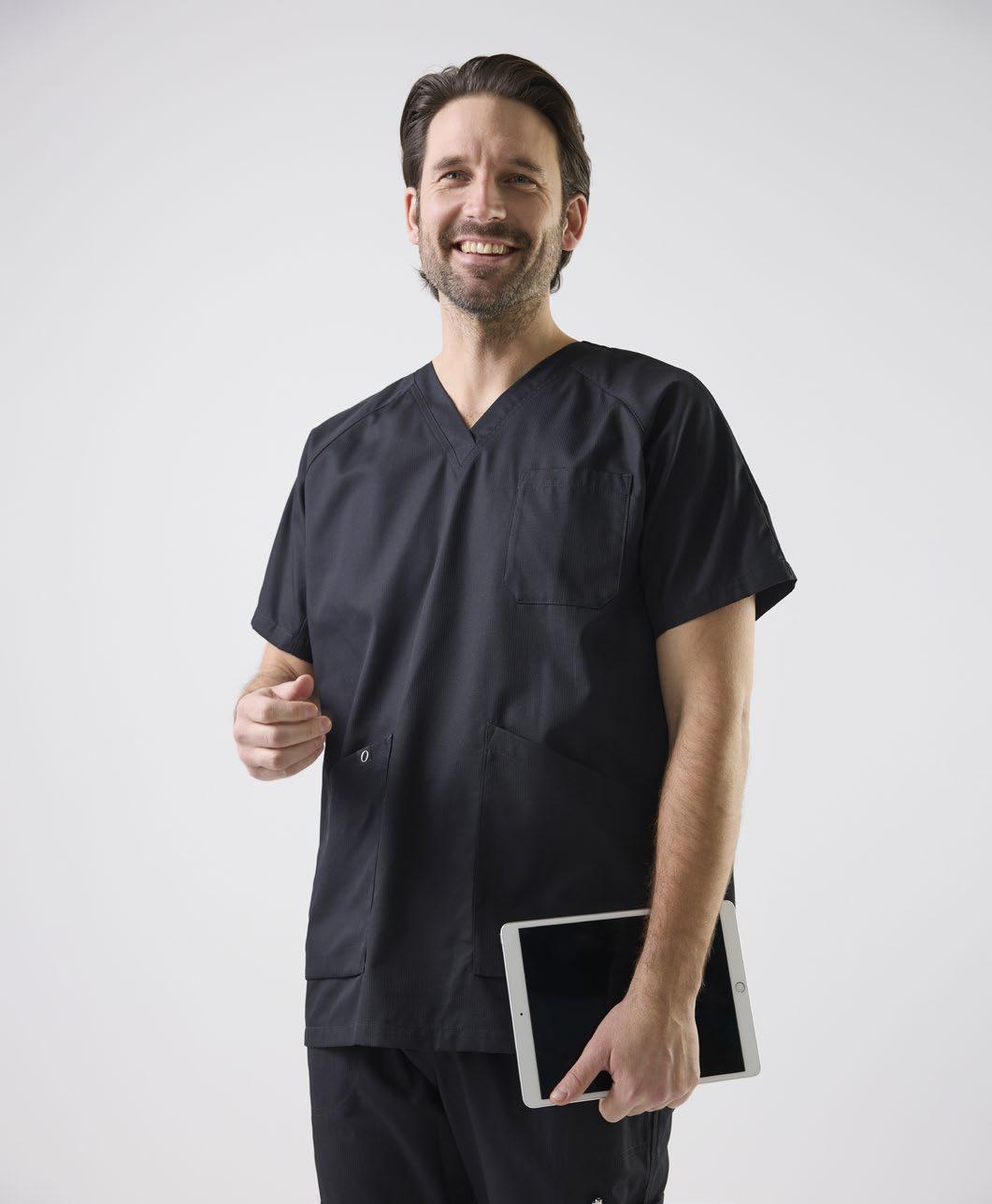 Milo Tunic är en unisex V-tunika med rak och bekväm passform. Raglanärm och paneler i sidorna ger ökad rörelsefrihet. Utrustad med rymliga framfickor inklusive mobilficka och nyckelhållare samt en praktisk bröstficka.