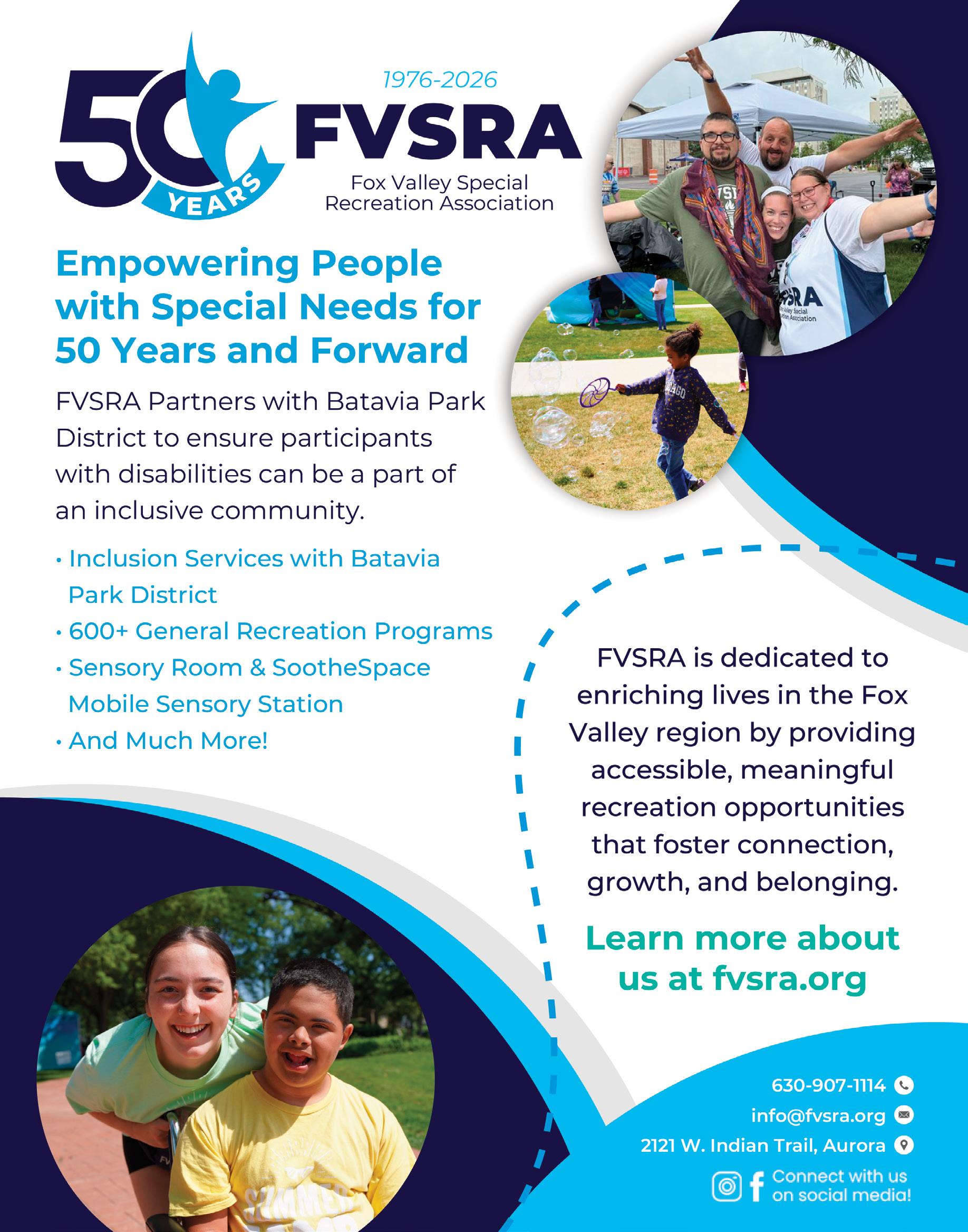 Batavia Park District works collaboratively with the Fox Valley Special Recreation Association (FVSRA) to provide reasonable modifications for individuals with disabilities who need assistance to participate successfully in programs.