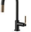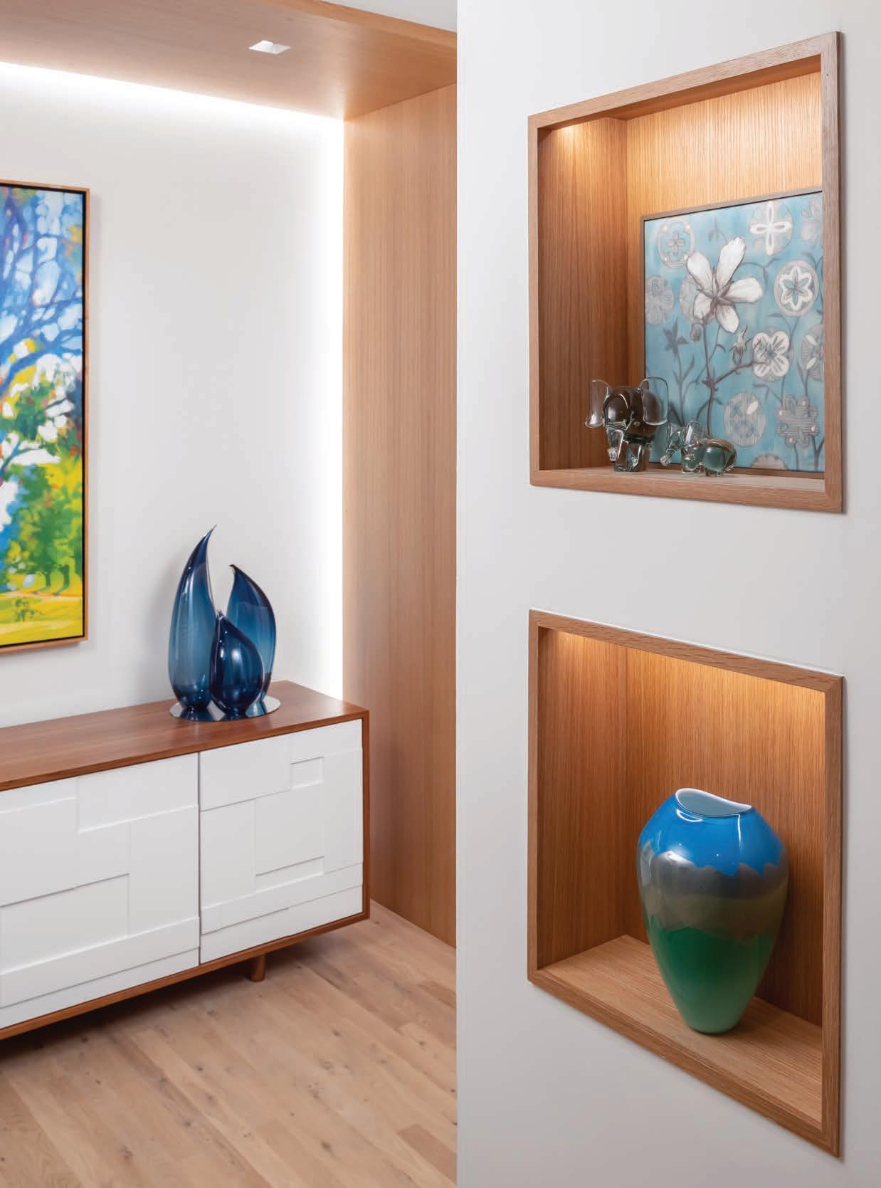 • While the prominent colors and curves are the lead performer in the kitchen, there are plenty of supporting cast members with a custom white oak range hood, marble inlaid mosaic above the range, Cambria countertops, personalized cabinetry for appliances and electronics charging, and a built-in buffet.