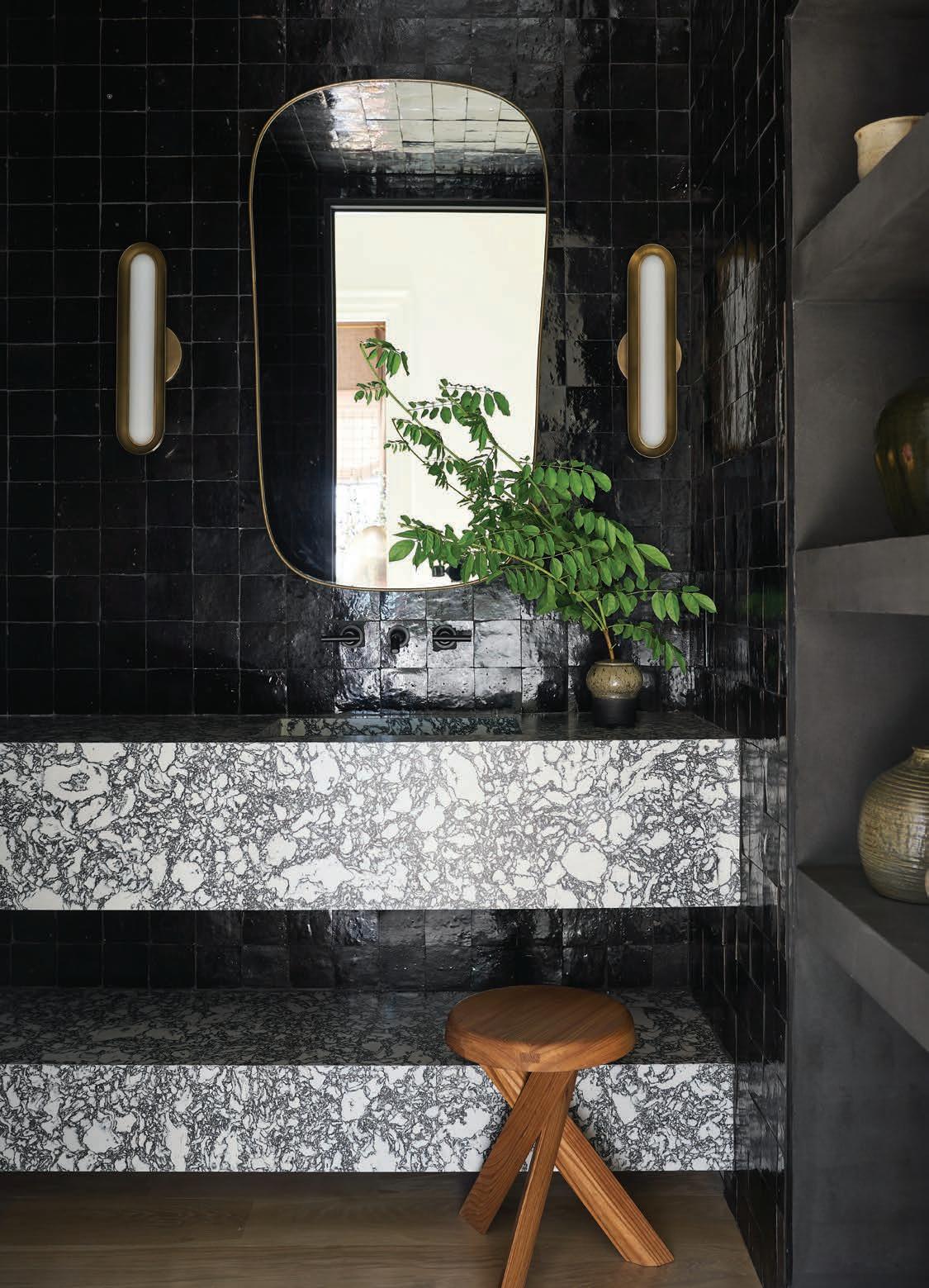 • The use of color and detail elevates this home to another level. The vibrant yellow pantry cabinets radiate playfulness and embrace the homeowner’s desire for spirited moments through the design. The powder room boasts a marble sink sourced all the way from Istanbul, Turkey, captivating visitors with its depth of character.