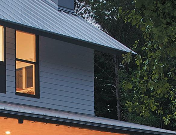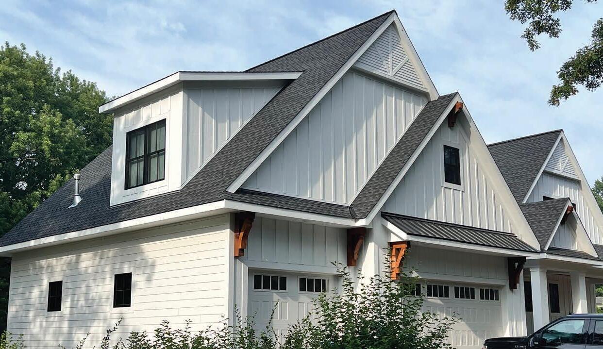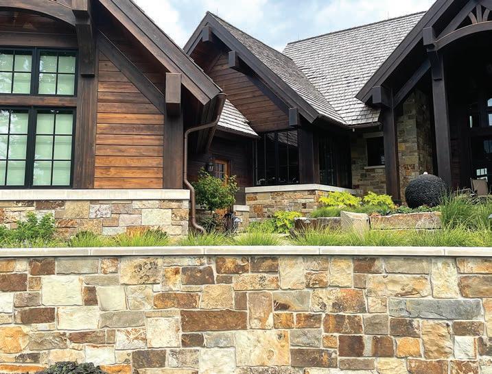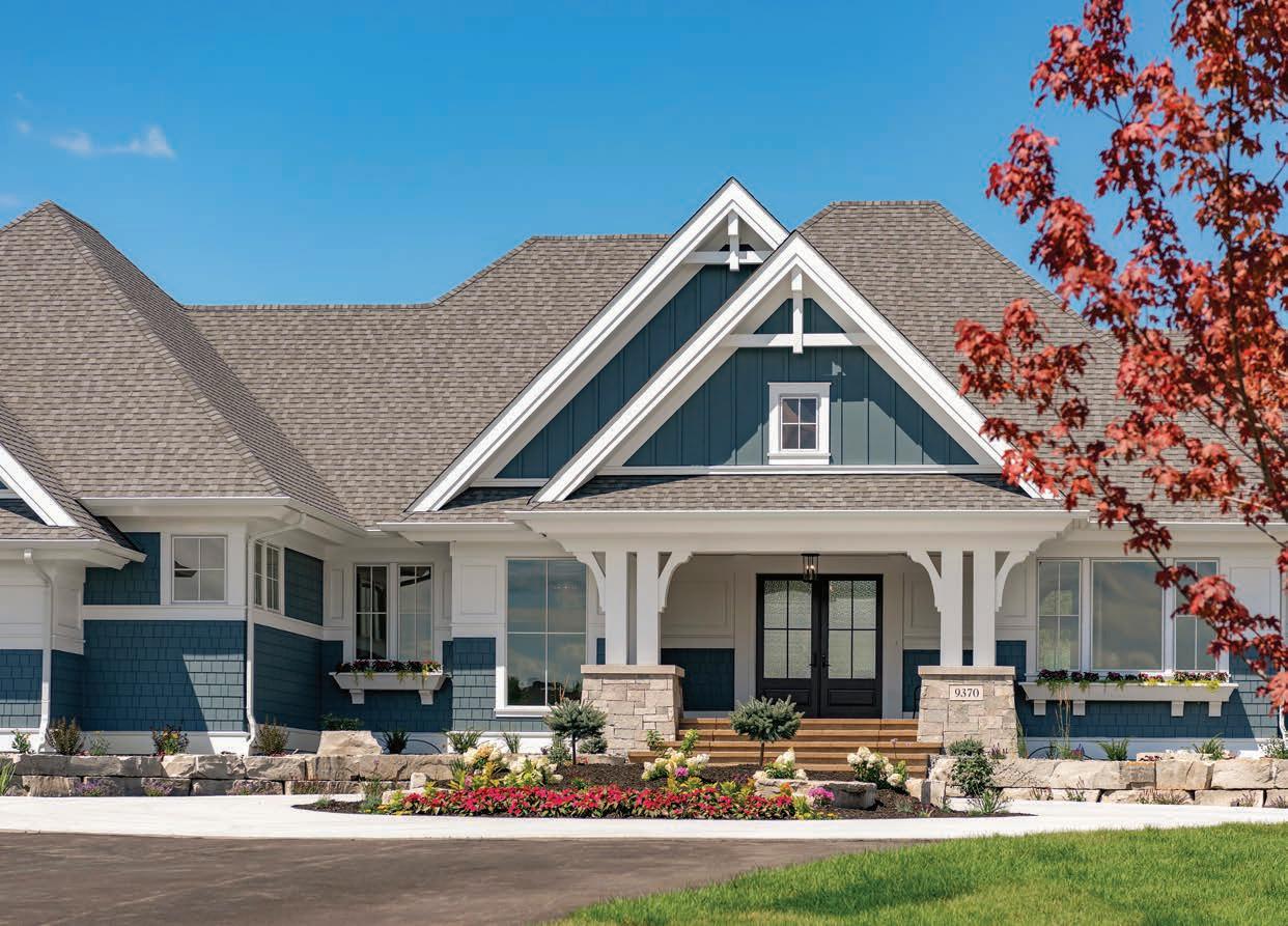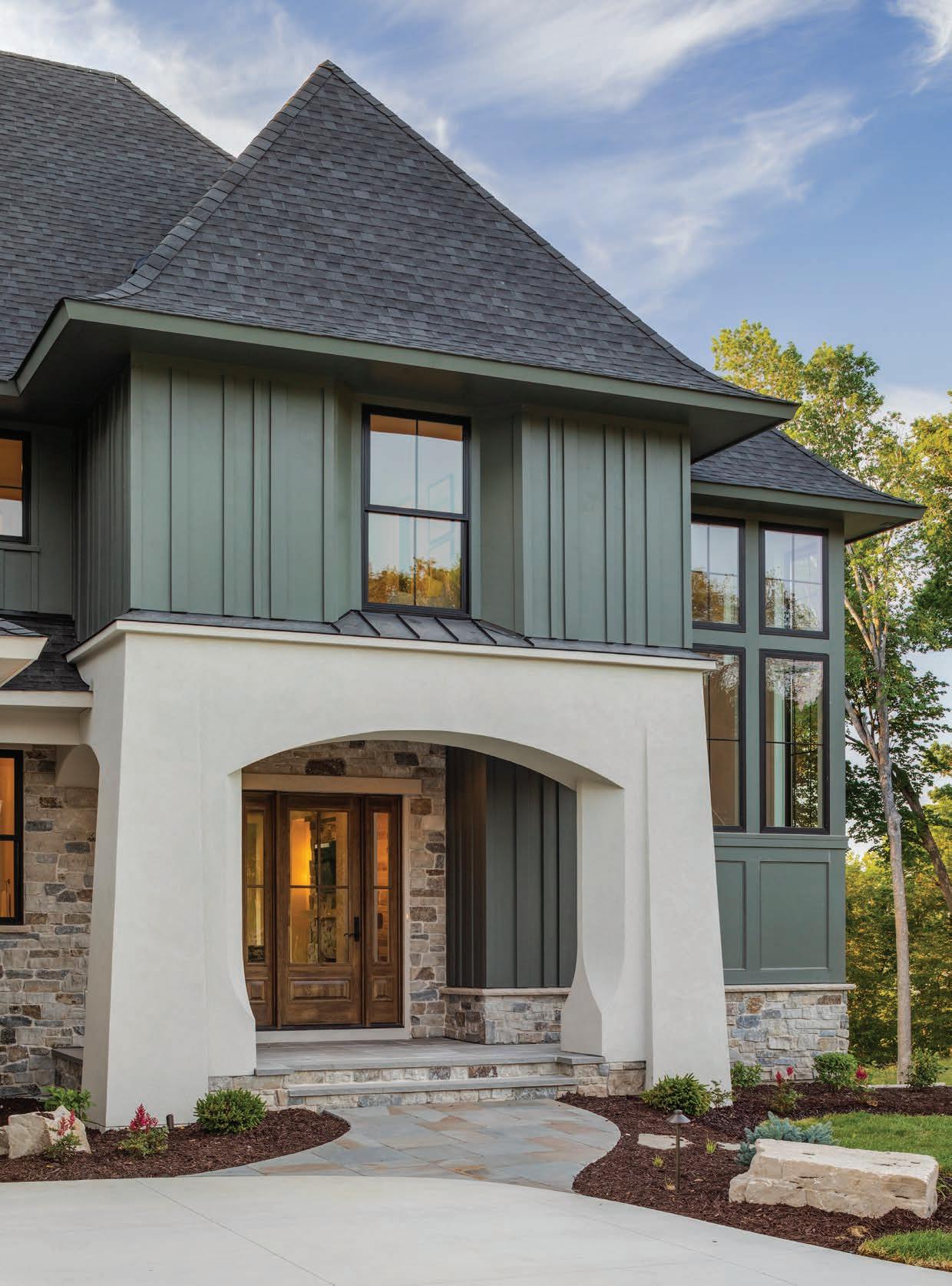 • The exterior of the home greets visitors with James Hardie siding in Benjamin Moore’s Wrought Iron with Sherwin Williams Caviar trim that is complemented by Fond Du Lac Stone ridge.