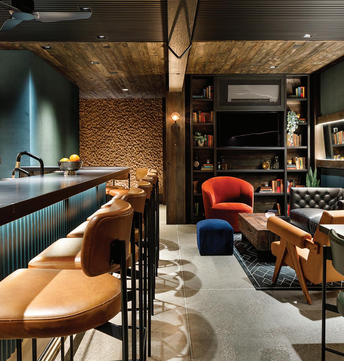 • The lower level was completely transformed, creating a great space for hosting parties or for the kids to invite friends over, with a pool table and an in-home bar providing plentiful entertainment. Inspired by the homeowners’ love of Chicago, it features a brick wall, wood columns, and a stadium feel.