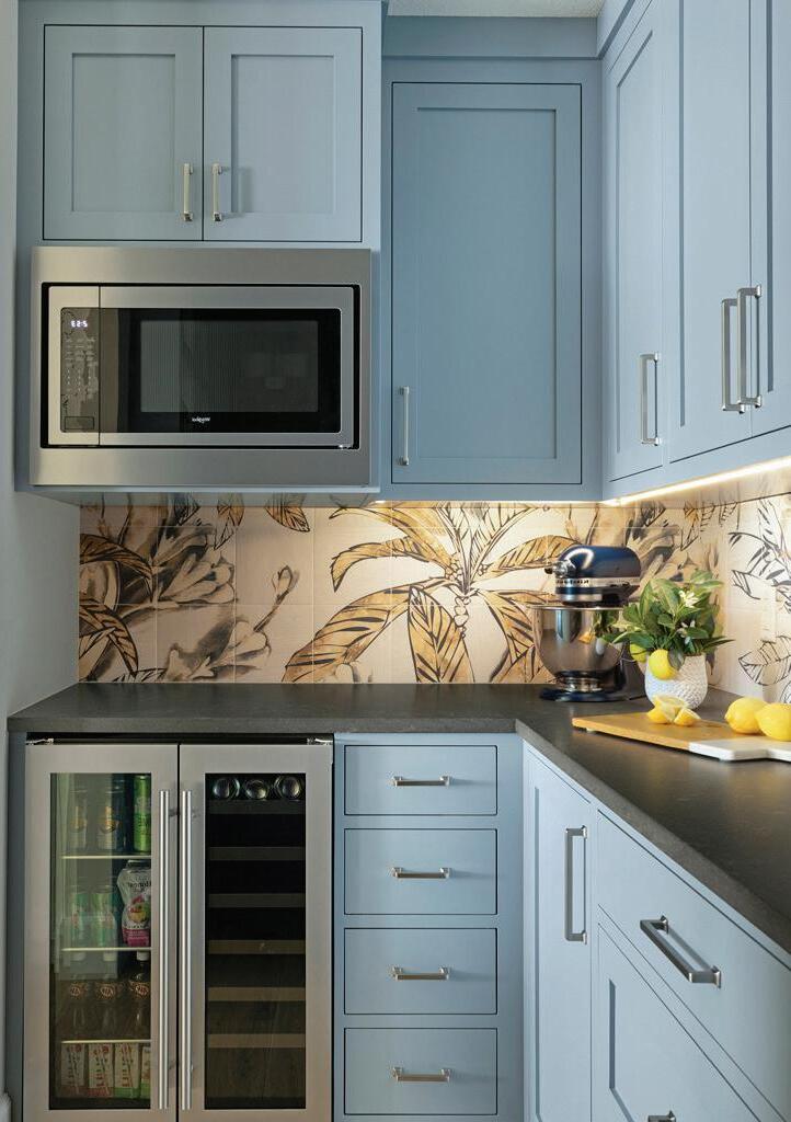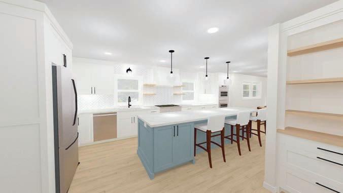 Don’t miss a stop at this remodeled kitchen! What began as a closed-o kitchen with dark oak accents is now a bright & updated space characterized by hints of Scandinavian-inspired blue. White cabinetry and light grey subway tile extend to the ceiling, adding height and light to the space. Meanwhile, a blue island and hutch playfully complement a varied blue glass mosaic tile behind the range. White quartz countertops top the cabinetry and a new island with ample breakfast seating. Floating reclaimed shelves, textured glass pendant lights & re nished light natural wood flooring complete the space. A perfect balance of not too much or too little!