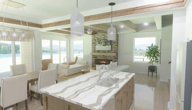 This 1977 Crooked Lake residence was remodeled for and by one of the owners of Murphy Bros. Design | Build | Remodel. New siding and windows were rst. Inside, the kitchen was cramped, poorly designed, and badly lit. All the flooring in the main level needed replacing too. The lower-level bath, laundry, and mudroom needed and got an overhaul. On the main floor, we hand-framed a custom shiplap vaulted ceiling, installed engineered flooring throughout, added a professionally designed lighting scheme, Cambria countertops, custom-designed and hand-crafted birch cabinetry, retro tted a gas insert replace, and installed a custom-made range hood.