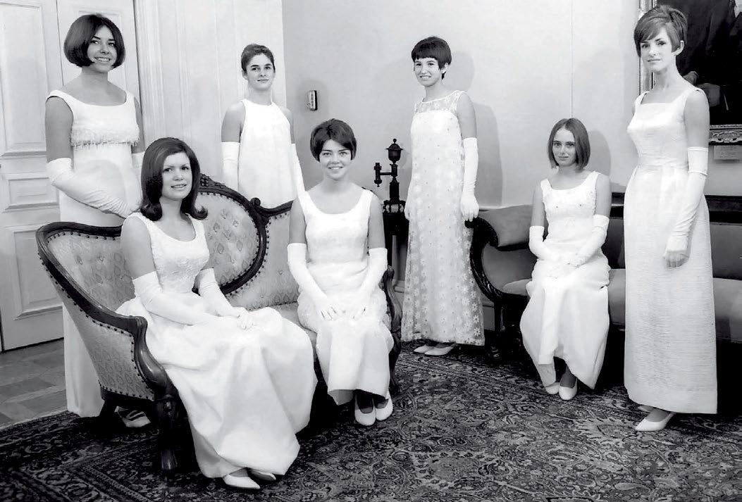 The fashion in the 1968 photo is sleek, she says: mostly short hair (popularized by Vidal Sassoon and fashion models like Twiggy), white, Empire waist dresses (gathered just under the bust), and white, elbow-length gloves. “You are looking at fashions that are more socially conventional,” says McDowell.