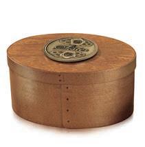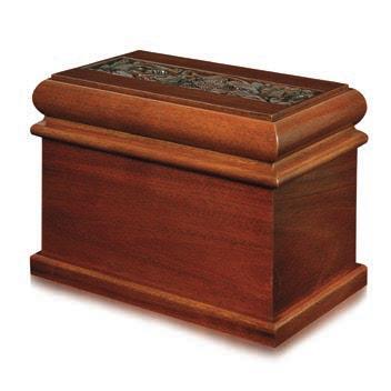 Crafted in a chest-style silhouette, this light brown or dark brown wood urn features carved side panels and metal accents for a distinctive, organic look.