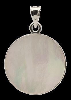 Constructed of Sterling Silver. Measures .8”W x .8”H x .21”D. Chain sold separately. Engraving available on back, initials only. Colors include Mother of Pearl, Blue Lapis, Malachite, Tiger’s Eye & Onyx.