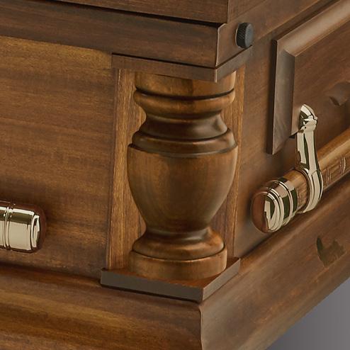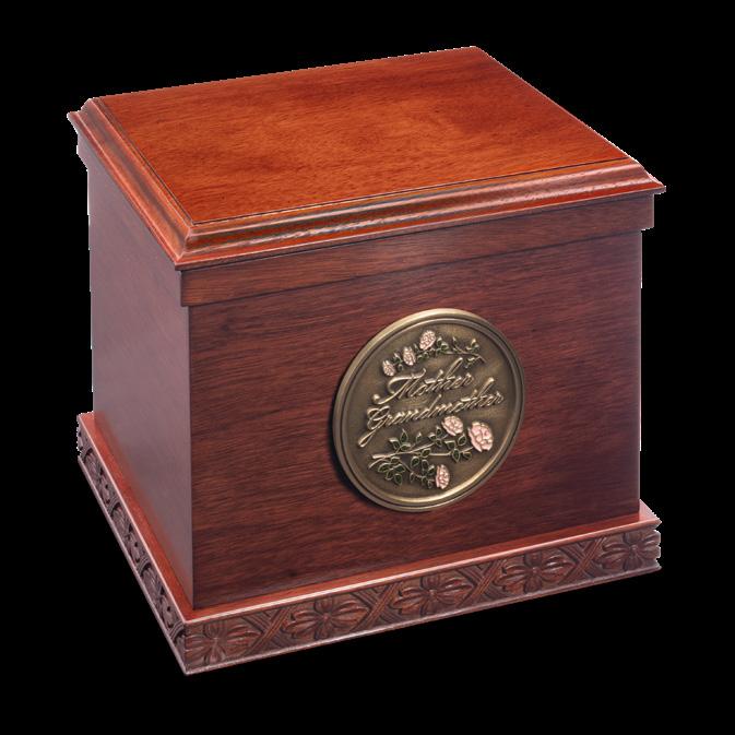 Features a velvet-lined tray for treasured keepsakes. A wood top allows for engraving, and the bottom chamber is designed to fit a plastic temporary container (included), sheet bronze chest, or biodegradable box urn. Included is your choice of a Display Medallion.