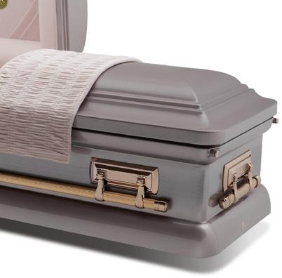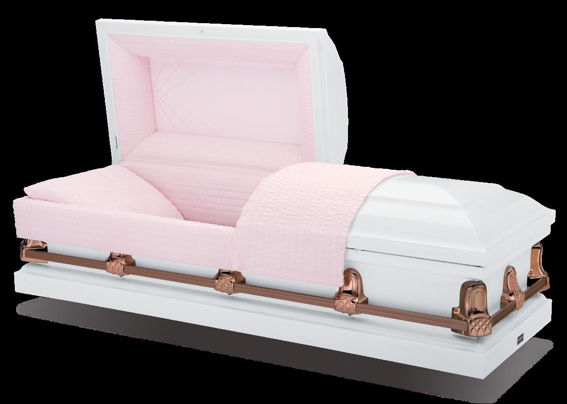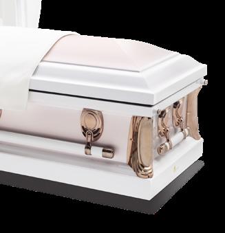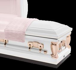 This legacy casket features a white painted finish and copper accents that give the A40 Primrose a distinct, beautiful look. Complementary-colored fabric is gracefully highlighted by embroidery uniquely suited for this casket design. Color option includes Primrose.