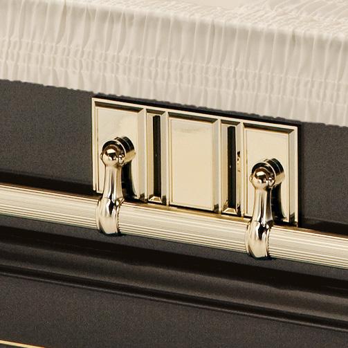 Crafted with time-honored craftsmanship, this casket features a distinctive shell design and antique swing bar hardware. It also includes wood post corners or a choice of four personalized corner options for a customized touch.