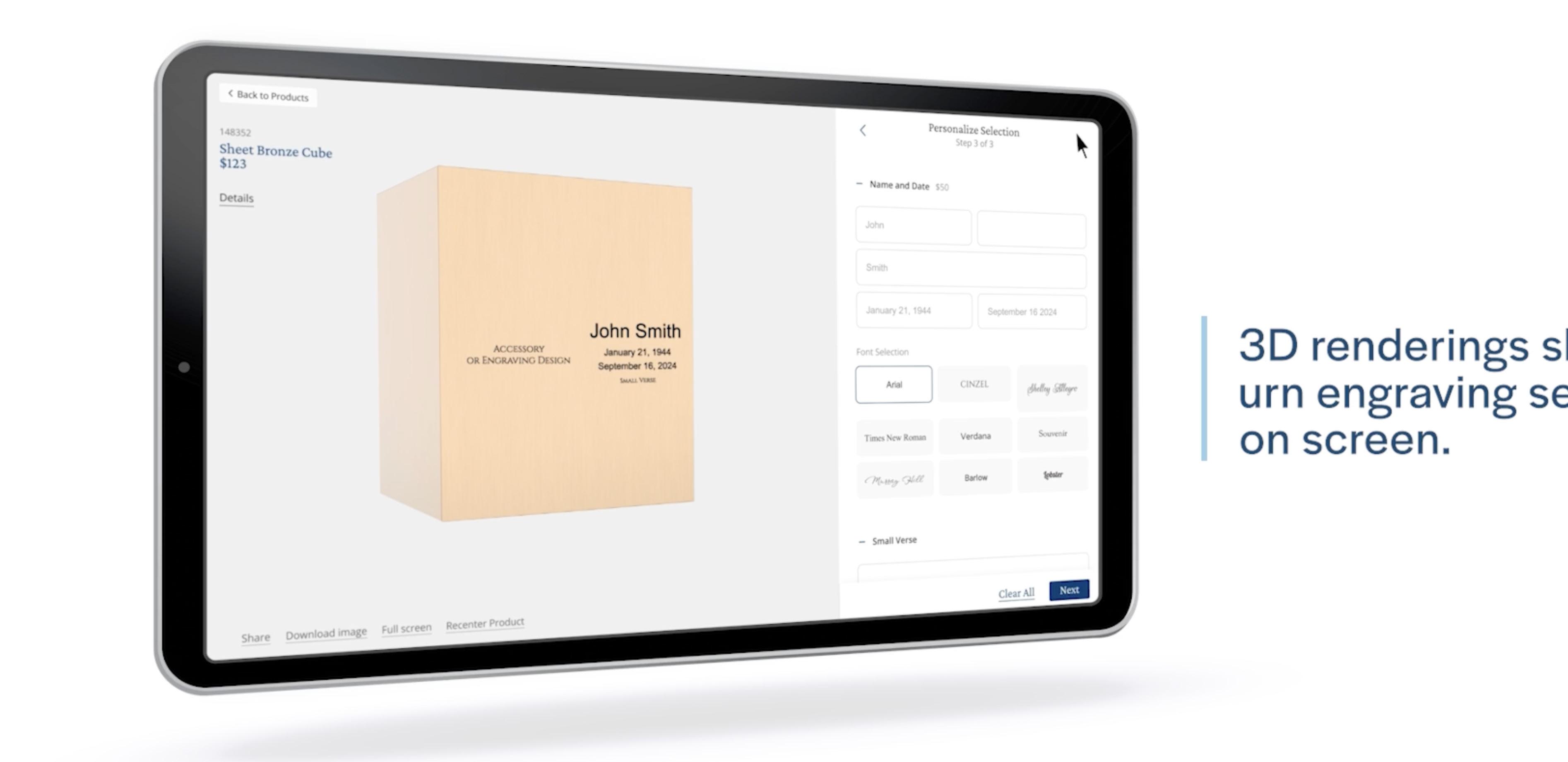 • Personalization Options: Our Family Choices ® Digital Showroom will help you guide them through their options. And real-time renderings of urn engravings will allow you to show these families exactly how their personalization choices will appear, building trust in you and their purchase.