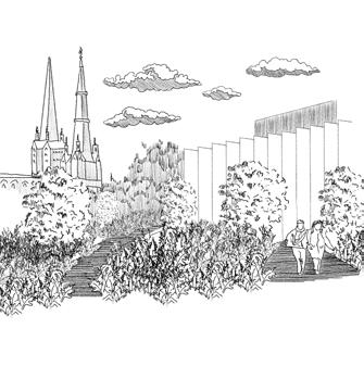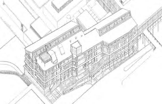 TOP: Wellbeing (North) entrance BOTTOM: Isometric studies of Exoskeleton (planted/walkable)