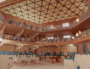 fostering activity, conversation, and connection as a natural extension of the land. The chamber, elevated yet transparent, is designed with fritted glass to bring in natural light and allow visibility, encouraging openness and curiosity. Its materiality signals accessibility, inviting people to engage on their own terms. Inside, organic spaces flow naturally from the roof, shaped to feel like extensions of the site itself. This fluidity transforms civic life into an experience of discovery, belonging, and participation—an invitation to connect with governance, the land, and each other in meaningful ways.