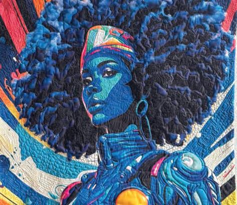 Earamichia Brown, Force of Nature, 2024. Mixed media textiles. Courtesy of the artist and SAQA; Marc Chagall, Midday in Summer, 1961. Color lithograph on Arches wove paper. Collection of the Park West Museum.