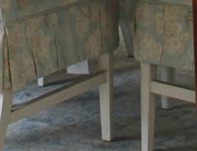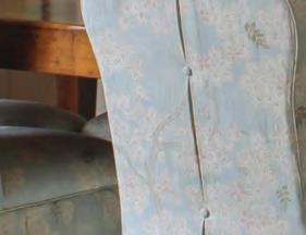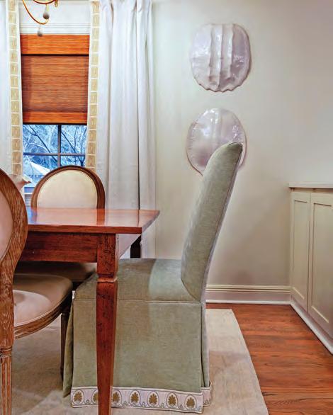 Large white turtle shells add dimension and texture to the space without overpowering the delicate details and comfortable atmosphere. The end table dining room chairs were sourced in Destin, Florida, by McCraney’s mother and recovered in a sage green fabric from P. Tree Textiles, with an embroidered trim that adds just the right amount of interest. The curtains hanging in the dining room have previously lived in both McCraney’s parents’ home and her older sister’s home.