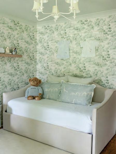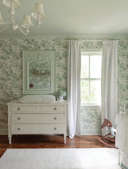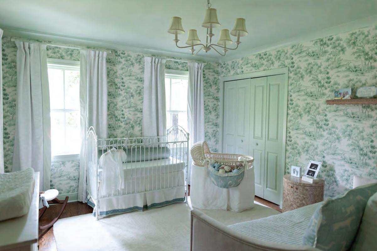 The first decision that was made was the selection of a Schumacher Borastapeter wallpaper in “Country Morning” for the nursery walls. Since blue was the color of choice for the Russells’ firstborn, Bo, for their second, a boy named John Henry, they opted for green. “The wallpaper was the jumping off point,” Helene says. “From there,