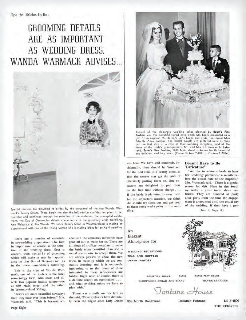 It’s no secret that every “big day” has a common centerpiece: the dress. With many young girls searching for their preferred style long before a potential husband comes along, it’s the first thing on most wedding planning to-do lists. In the February 1962 issue of inRegister predecessor The Register, local salon owner Wanda Warmack acknowledges this sentiment. Something she stresses is the importance of smaller details and “grooming” to tie the special look together. Although trends in these subtleties are ever-evolving, Warmack explains they are key for brides who want “the unusual and the spectacular.”