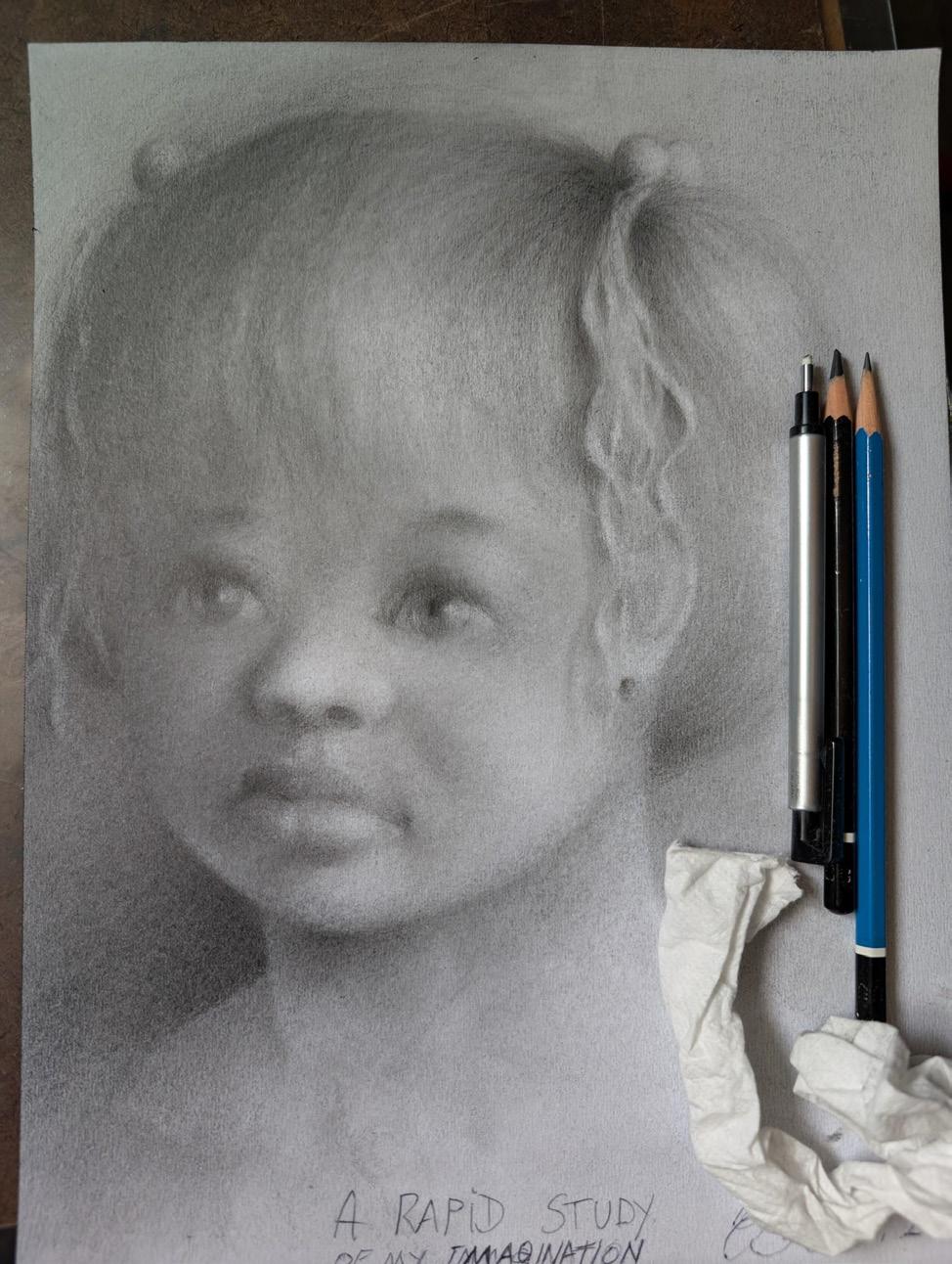 I wanted to see what’s possible when drawing a portrait using only two pencils; Lumigraph Black and an H4 very light pencil. I also used a tombo mono eraser and some tissue paper. It took a little practice but it was possible to obtain a reasonable level of shading, shadow and highlights with only the above mentioned tools when used sparingly. It may not be necessary, in a lot of cases, to have a complete set of graphite pencils.