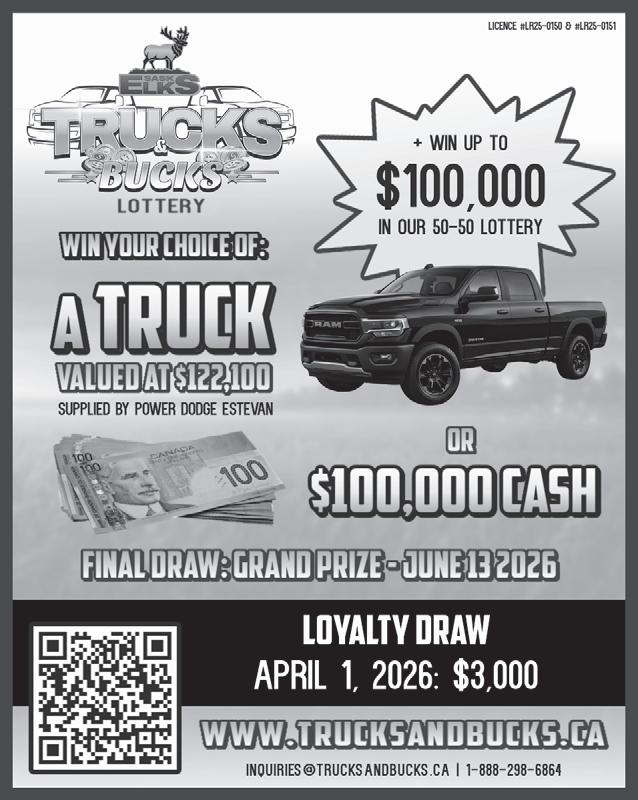 fish fry is Saturday, April 4, in Mayfair Hall, with doors open at 5:30 p.m. Only 250 advance tickets are available at $25 each and kids under 12 years old are free. For tickets, please call 306-441-4137 or 306-441-6845. It’s the usual evening of a delicious supper, a bar, raffles and awards. The 2026 memberships are $25 for a regular membership, spouse $35 and family $40. These can be obtained by email: thickwoodhills@ gmail.com