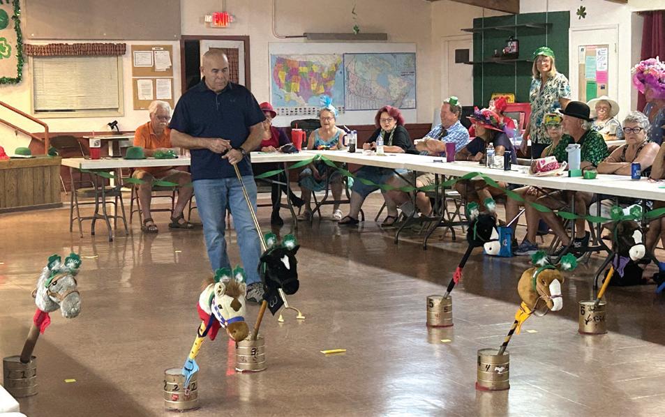 What do seniors do for excitement in the winter for park activities? This is horse racing with six hobby horses cemented into cans. Participants move them as the dice are shaken. Most parks offer a variety of activities (bingo, yoga, quilt making, card games, shuffleboard, pickleball). Friday night dances are well attended and music jams and karaoke are a close second. Anything to do with music is a crowd pleaser. | Photo by