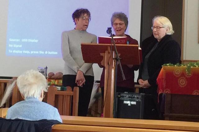 for girls who are sold to the slave trade, some as young as 12 years. The closing song, sung by the trio, was “Spirit of Gentleness.” Then Pastor Bruce Ehlert of the Lutheran Church in Langham and Radisson gave the blessing, and everyone gathered in the Lower Hall for fellowship. Offerings for the day were going to WWIC Canada.