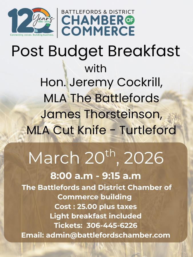 “Plan to join the Chamber and hear from the Honourable Jeremy Cockrill, Minister of Health and MLA for the Battlefords, together with James Thorsteinson, MLA for Cut Knife-Turtleford, as they share with us the highlights of Budget 2026,” the Chamber said in a release.