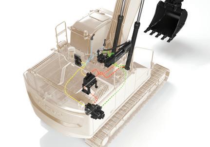 Reinforced structures and a heavier counterweight enhance stability, with larger hydraulic lines and higher pressures increasing power and service life at the dig end and reinforced boom and pivot points allow for higher load capacity.